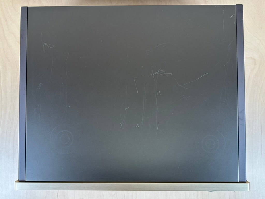 The tuner is in very good physical condition, but it does have some blemishes as follows. The faceplate is in very good condition, with small nicks on the top right and top left edge. They are barely noticeable. The top has several scratches, and three sets of ring marks from a unit that was placed on top. the sides have some blemish marks, as well as the back and bottom. There are no dents or deep scratches on the unit, and it presents itself very well. See the many pictures in the listing for further details.