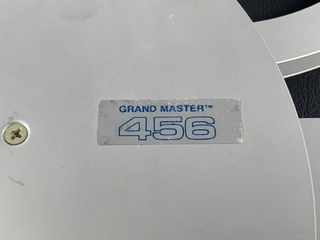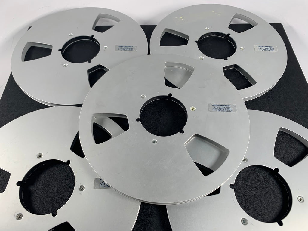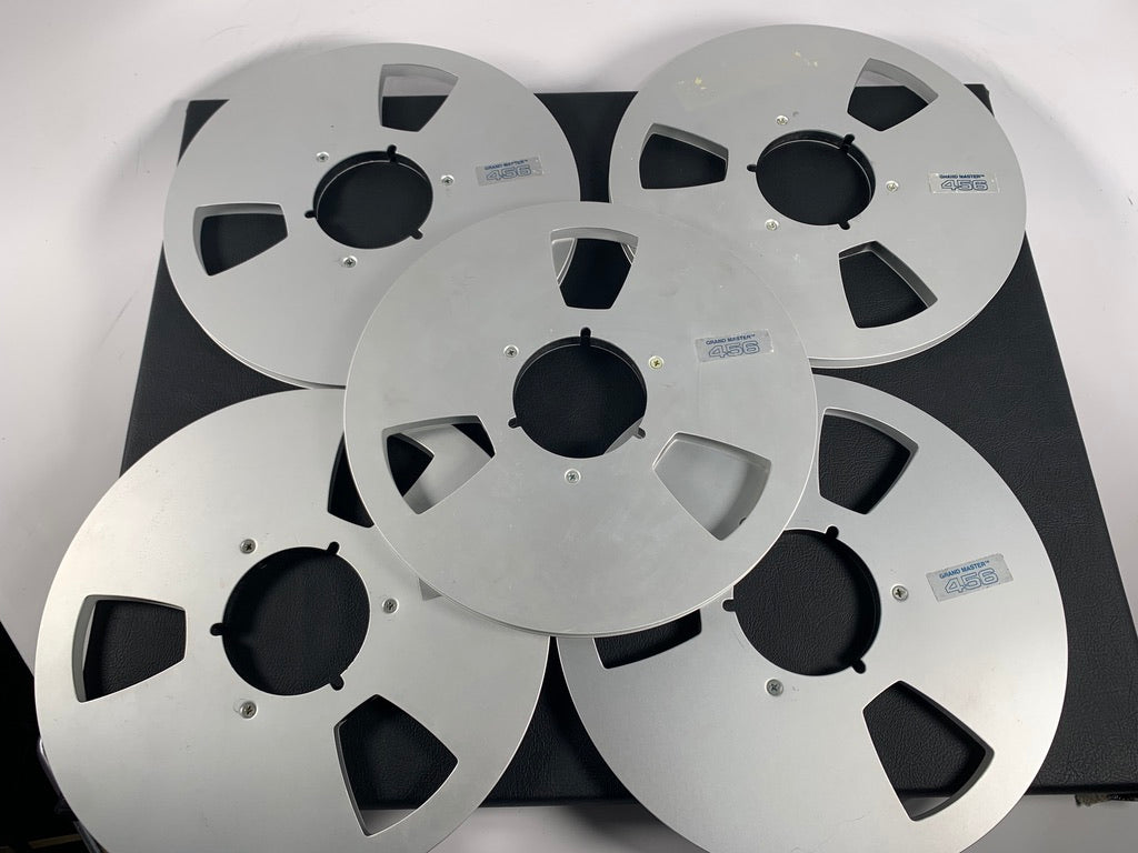 For your consideration, we have 5 vintage AMPEX 456 Grand Master 10.5" Metal Tape Reels for 1/4" Tape. The reels are used but in very good condition. Photos show both front and backs of each unit.