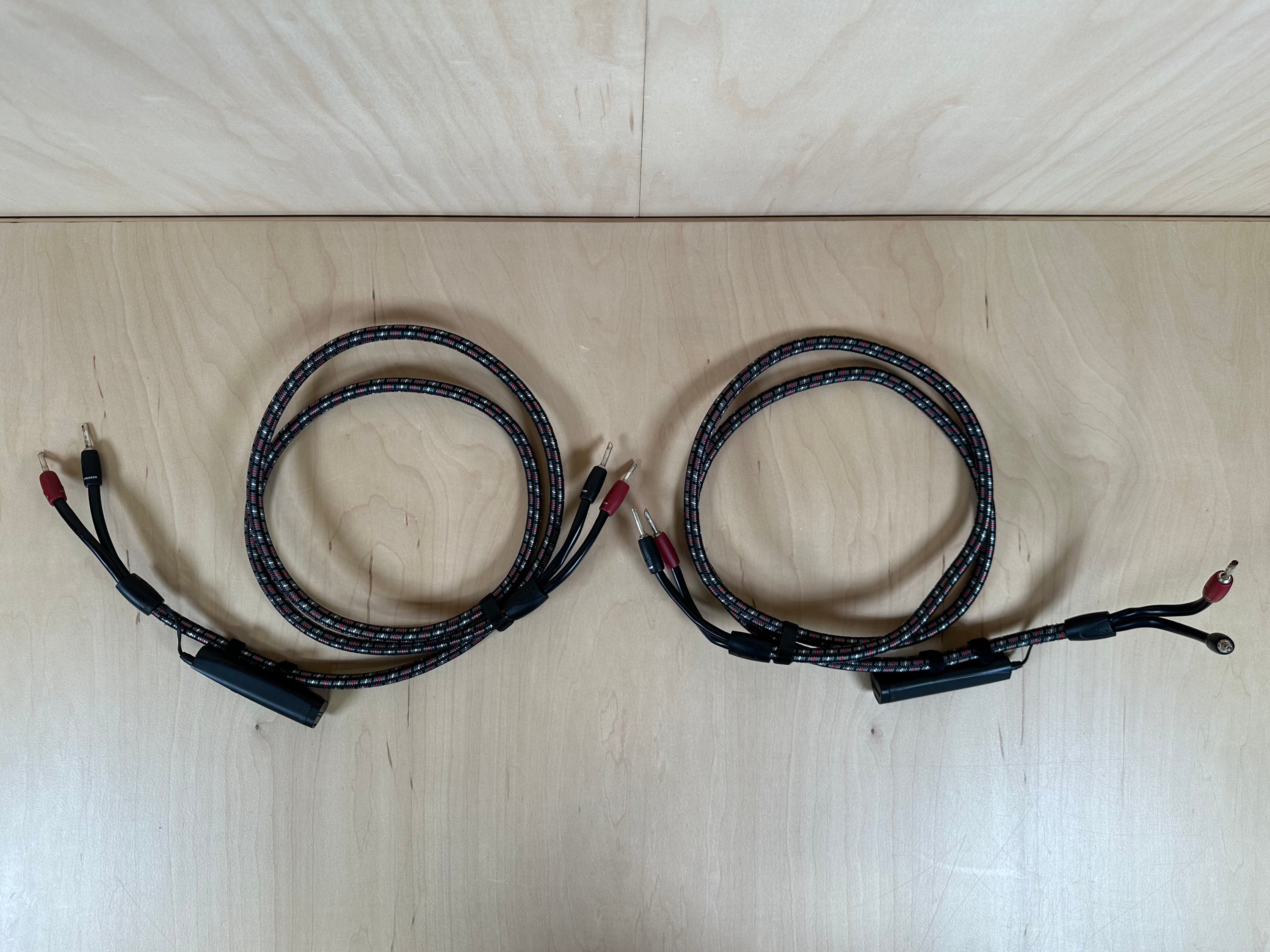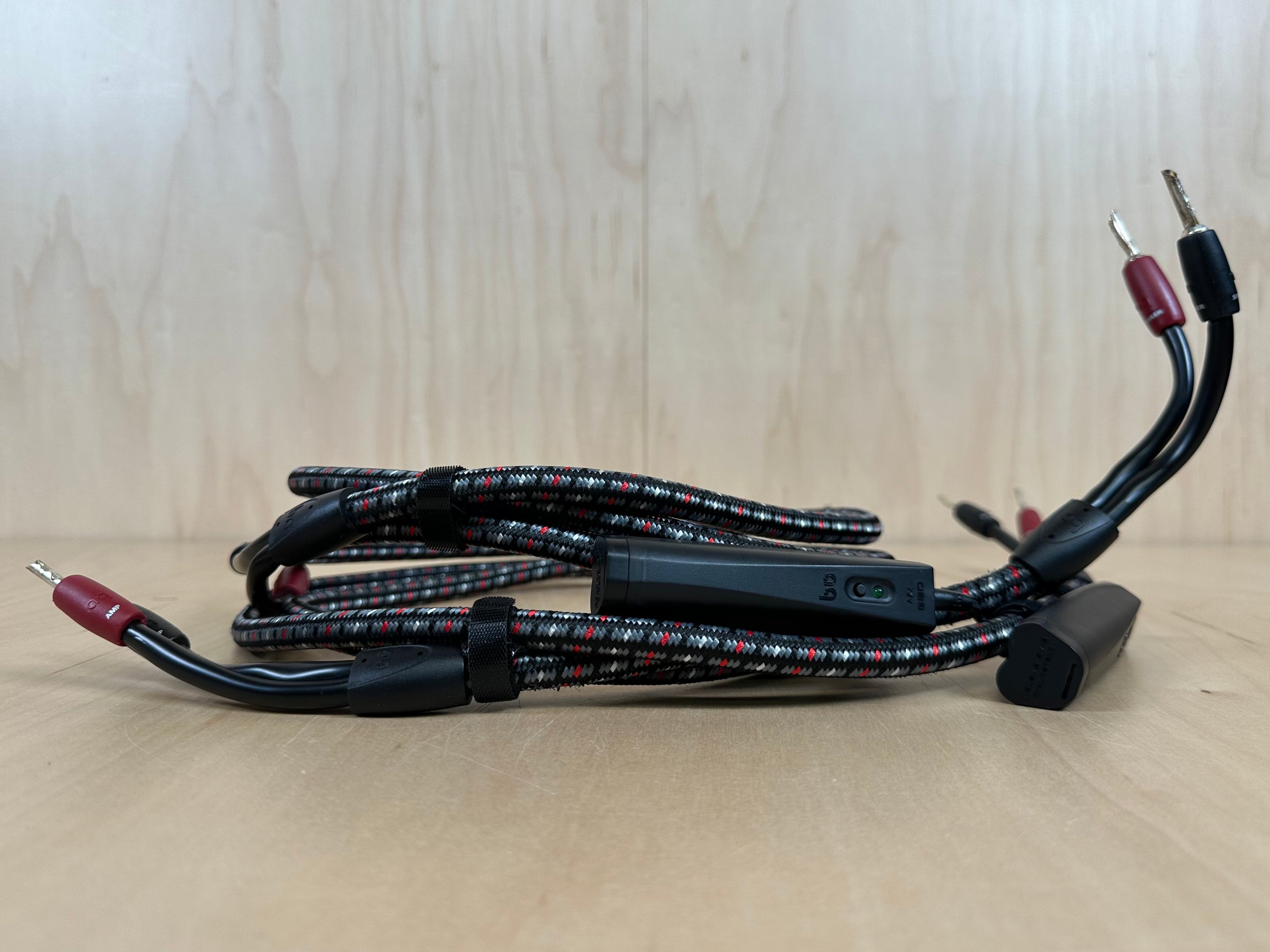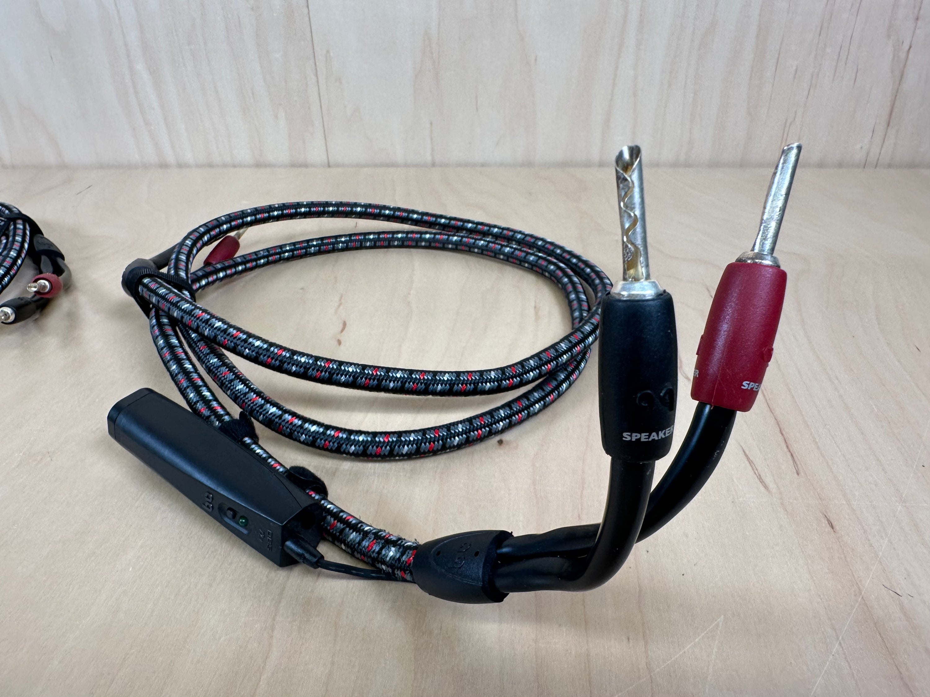 For sale, we have a 6 foot pair of AudioQuest CV-8 Speaker cables with banana connectors on all ends. The cables have been tested and are in perfect working order. While they were working when we got them, we installed fresh batteries for the Dielectric-Bias system. The cables are in very good, clean condition. Some of the banana fittings show some wear/bends, but all function as they should. See the pictures in the listing for further details.