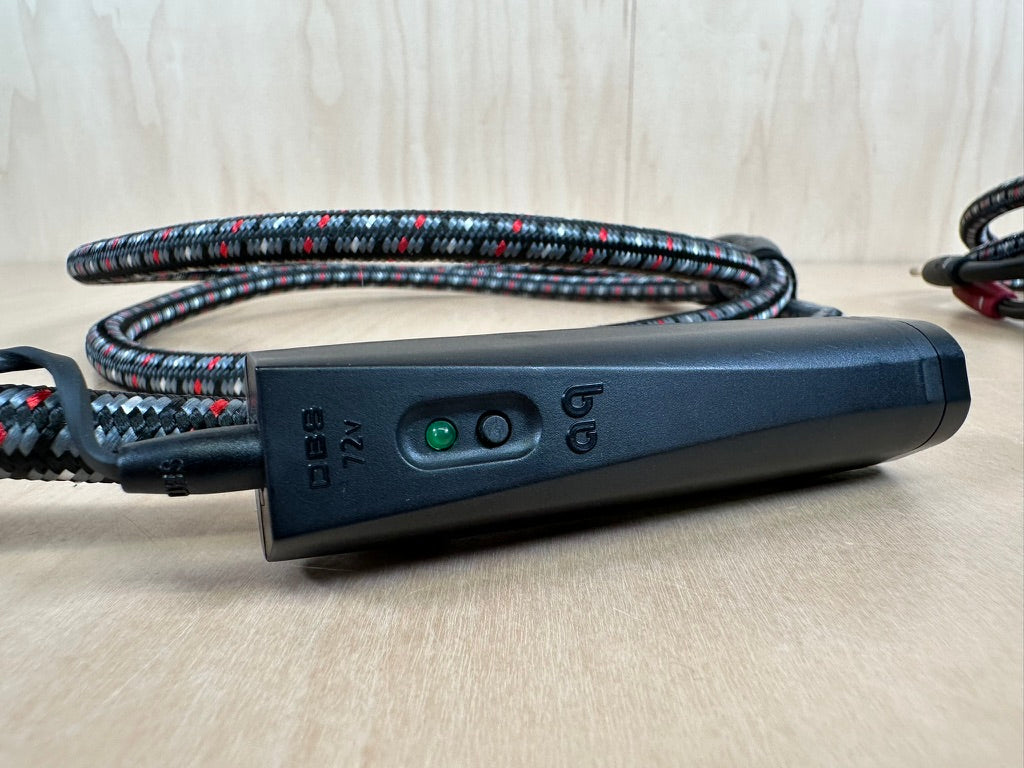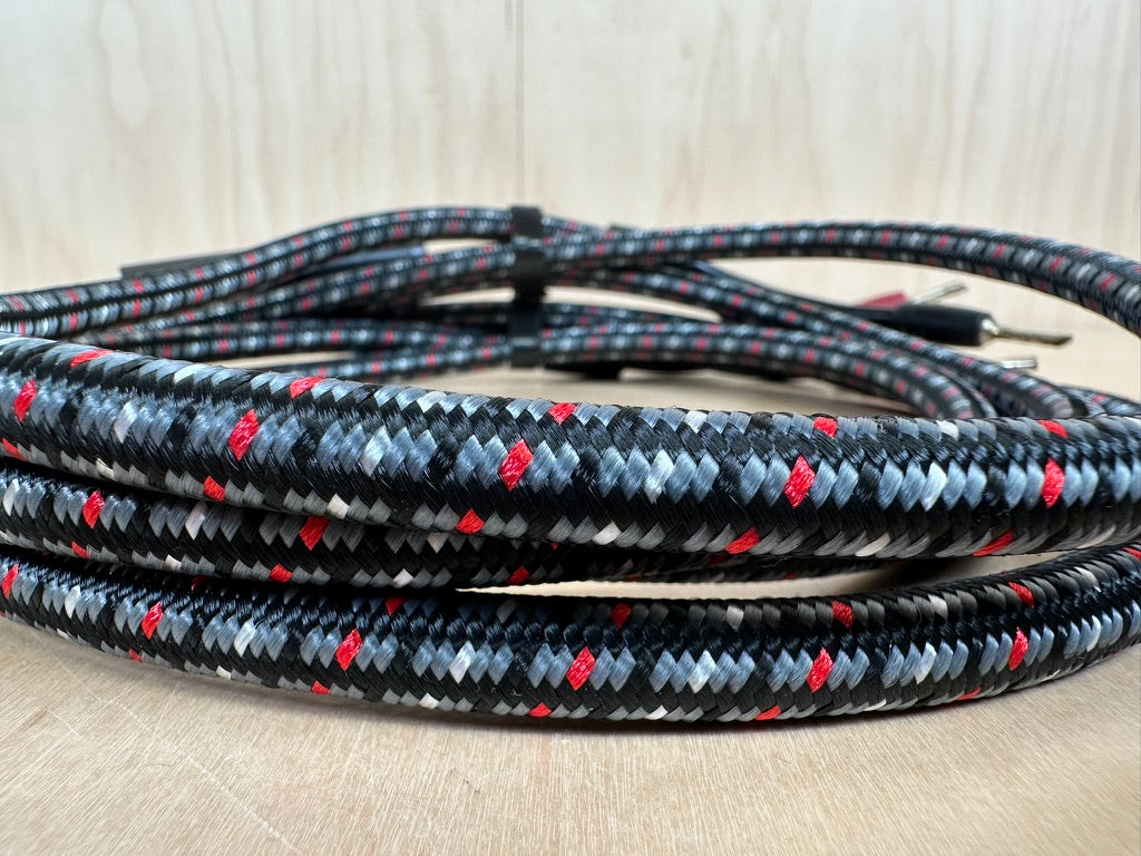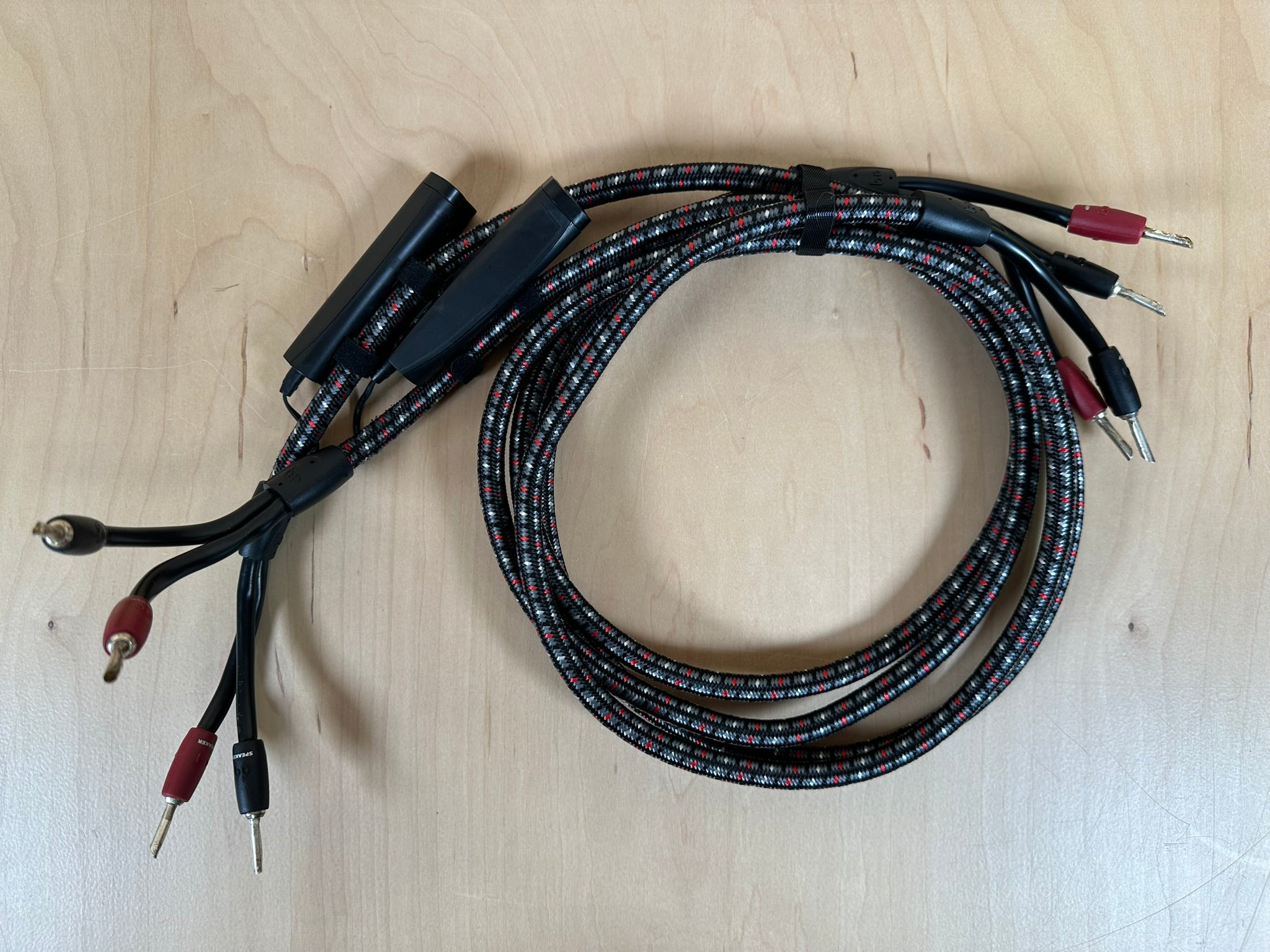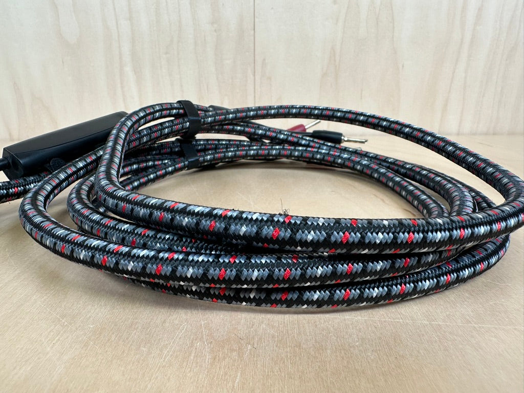 For sale, we have a 6 foot pair of AudioQuest CV-8 Speaker cables with banana connectors on all ends. The cables have been tested and are in perfect working order. While they were working when we got them, we installed fresh batteries for the Dielectric-Bias system. The cables are in very good, clean condition. Some of the banana fittings show some wear/bends, but all function as they should. See the pictures in the listing for further details.