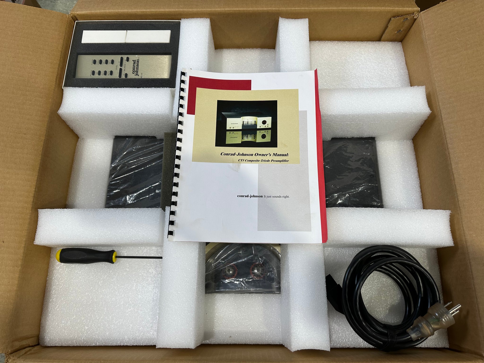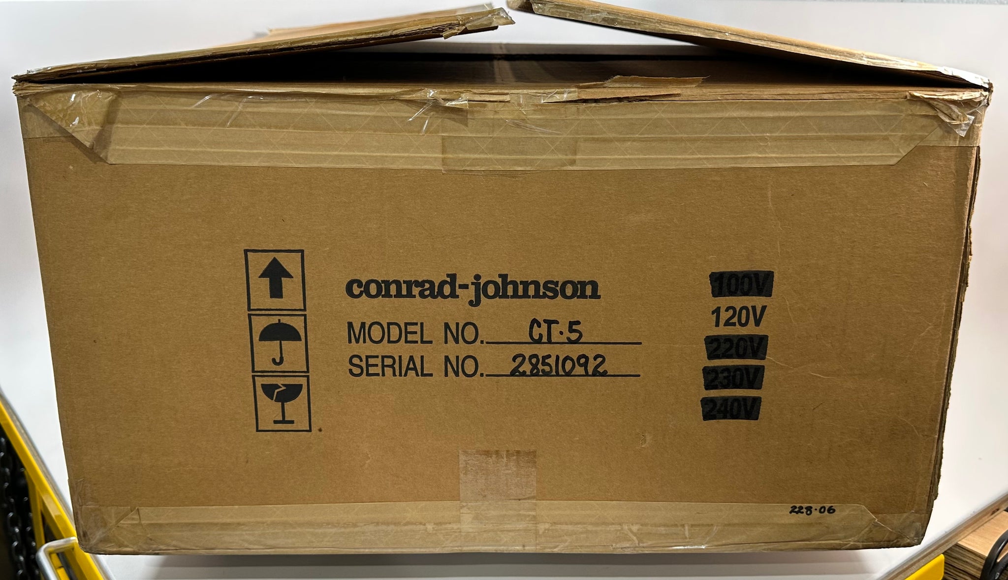 For your consideration, we have a one owner Conrad Johnson CT5 Composite Triode Preamplifier, in perfect working and like new physical condition. We are big fans of Conrad Johnson, and we loved having this Preamp in our shop. Note that this preamp is linestage only, so a separate Phono Preamplifier will be required to use a turntable. Coming from a home with no pets, smokers or kids, we were unable to find any blemishes or marks on the unit. See pictures for further details. The serial number as pictured is 2851092. Included with the preamp is the original box, with original packing, owners manual, remote control, AC cord, nut driver (to unscrew tube guards in order to replace tubes), 4 tube dampers, and two sets of tubes. The original set of tubes were replaced in 2015, with a pair from Conrad Johnson. The owner stated that he just figured it was time to get new tubes, but noticed no difference in sound. Testing on our Amplitrex AT1000 tube tester showed why he noticed no difference in sound as all four tubes showed minimal wear and tested as practically new.