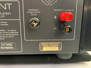 For your consideration is this Counterpoint Solid 2 Amp. This one owner amp is in excellent condition both physically and mechanically, a true survivor. It has been in storage for a number of years. Physically The only blemish we could find was on one of the cooling fins where we pointed out in the picture and just to be conservative some other minor scuffs. The amp has been cleaned and detailed. On the bench, the Solid 2 ran at full power for two hours where it passed and was within specifications. The capacitors show no sign of leakage or swelling. The Solid 2 is a class A dual-mono amplifier that drives 200 watts into 8 ohms and 400 watts into 4 ohms. It's an extremely clean sounding amp and it's one we have thoroughly enjoyed listening to.