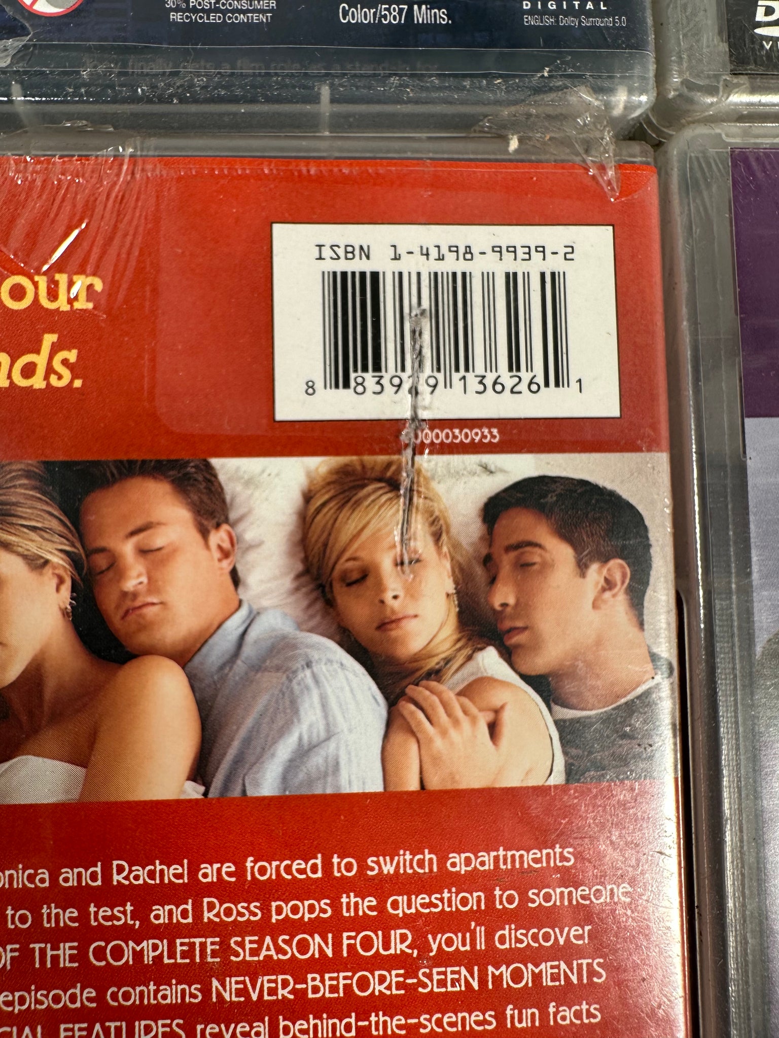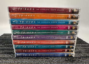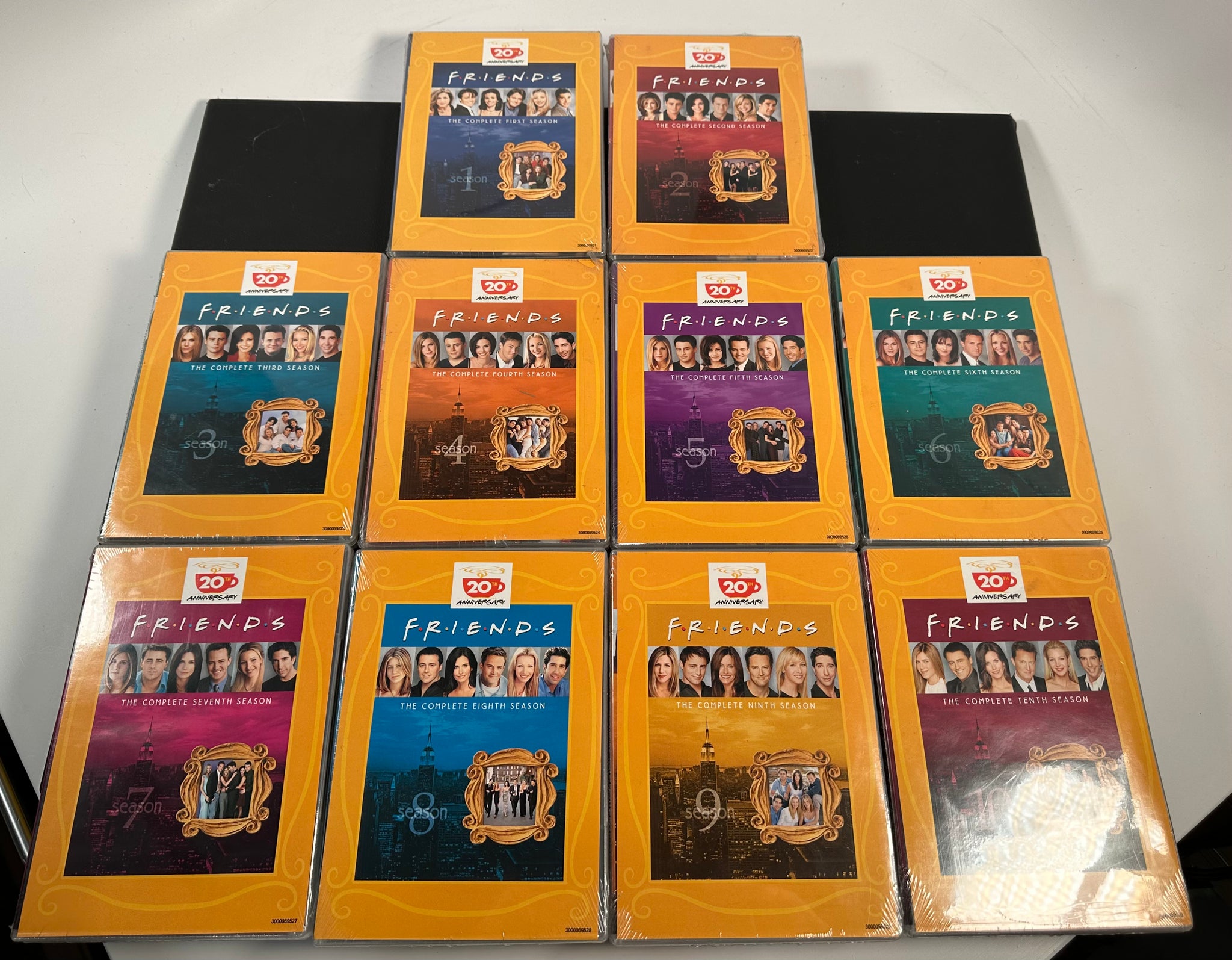 For sale, we have the 20th Anniversary Edition of Friends on 40 DVDs. All ten seasons are broken up into 10 DVD cases with 4 discs in each case. There is added footage on this 20th Anniversary Edition set. Each season is new and factory sealed, with a cut through the barcodes on each case. See pictures for further details.