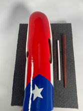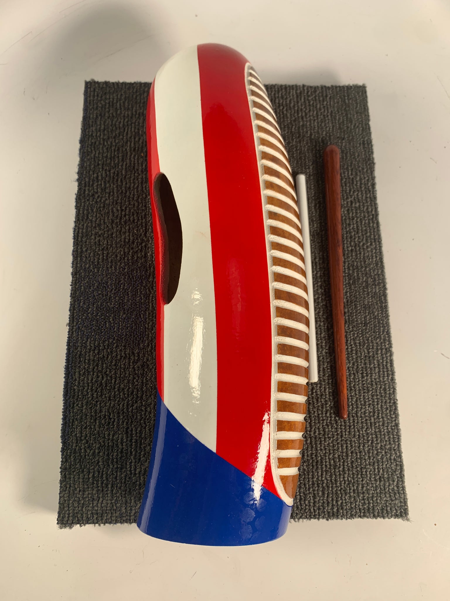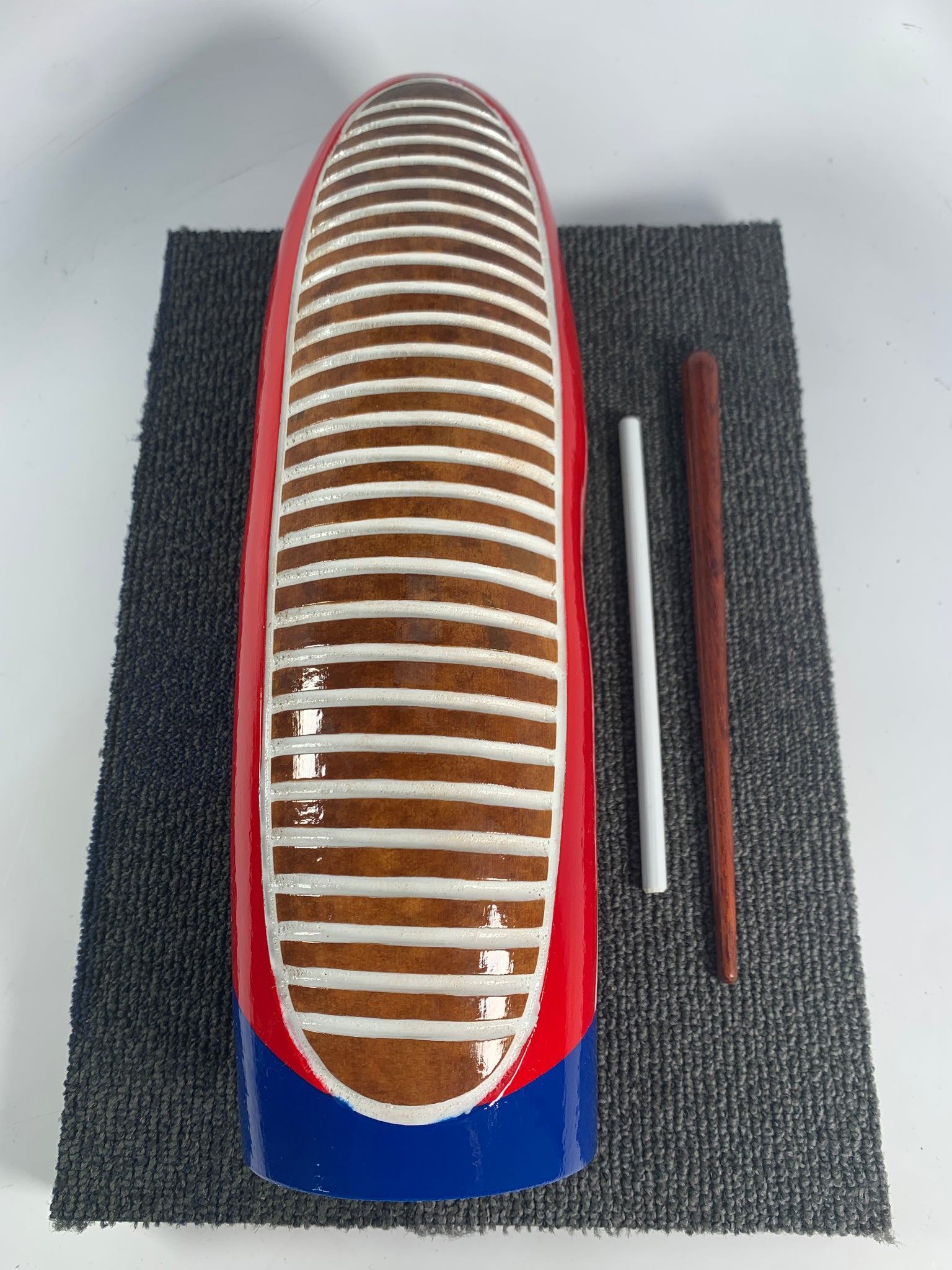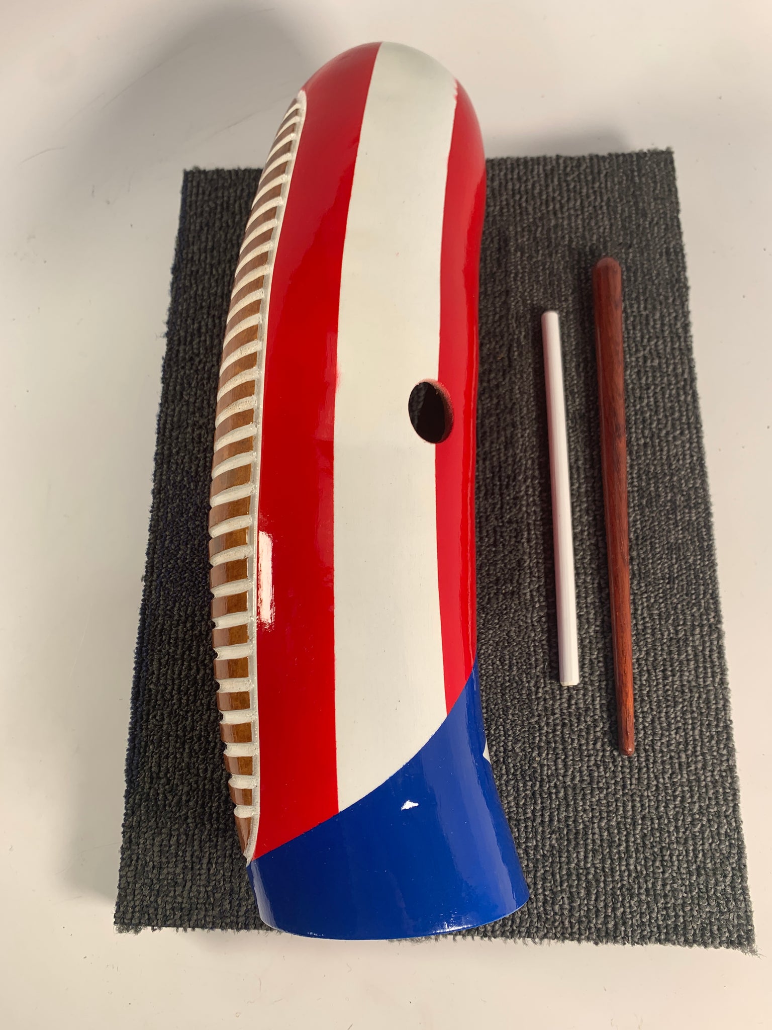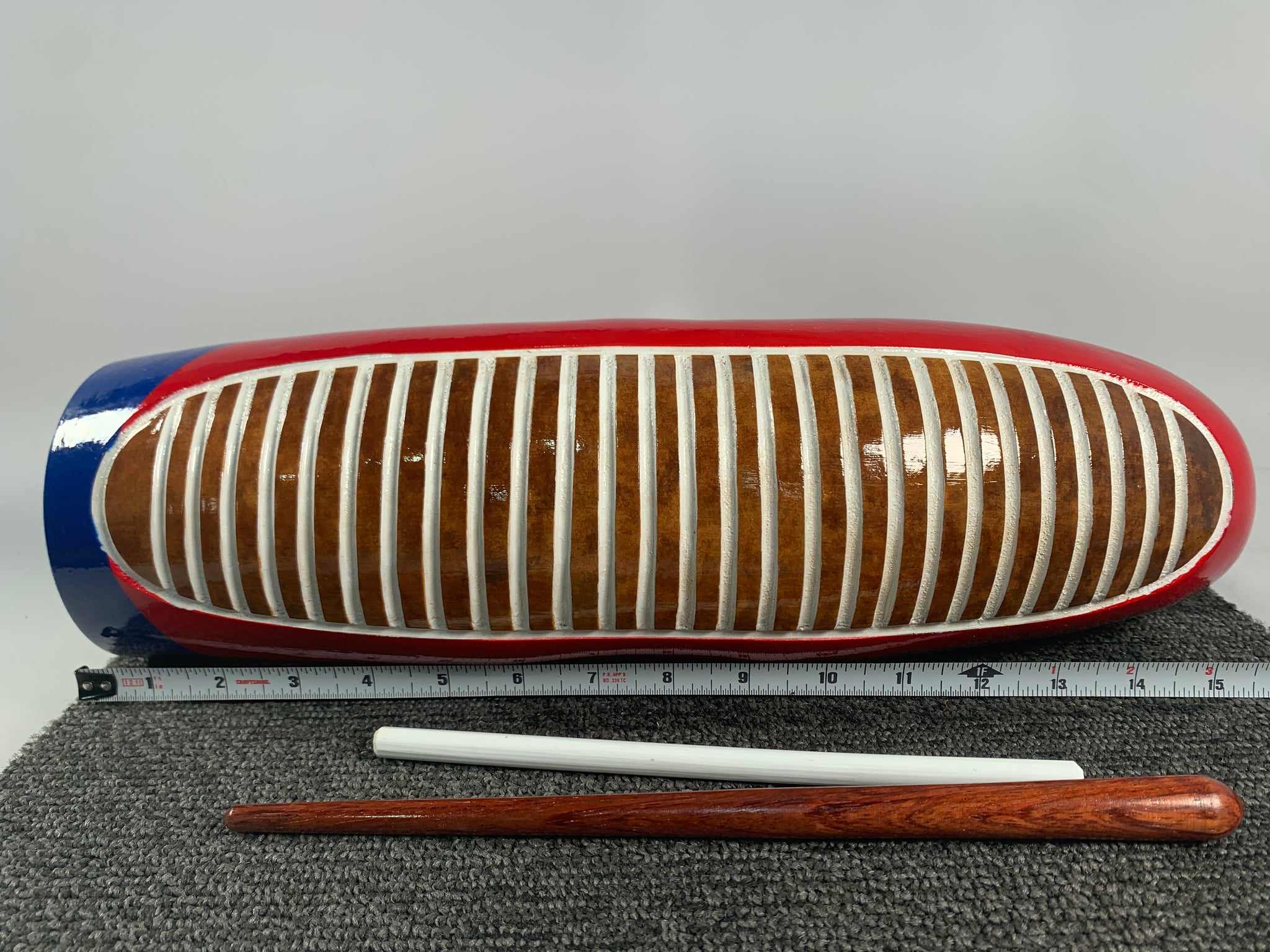 Professional Large guiro for sale in Painted Puerto Rican flag color scheme. This guiro is from our now closed record store that was located in the Subway at 42nd Street and Broadway in Times Square, New York. We specialized in Latin Music, and carried some percussion instruments. We closed during the pandemic, and did not reopen. This is stock from our now closed store, see our other instrument listings including, Leather Maracas, Cow Bells, and Metal Merengues Guiros. This is a handmade, gorgeous professional instrument. It comes with one wood stick, and one plastic stick.