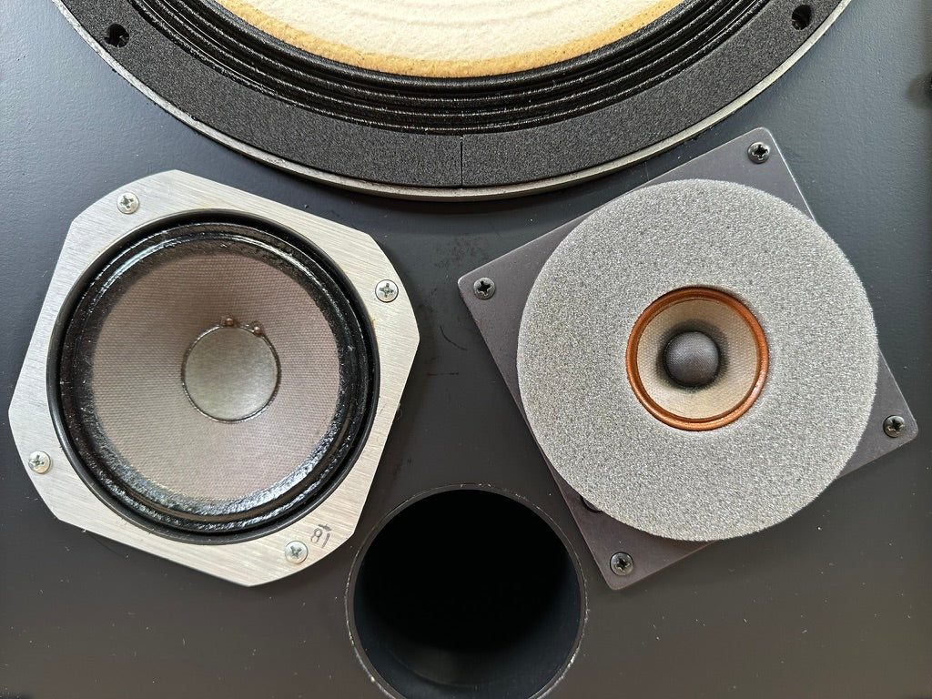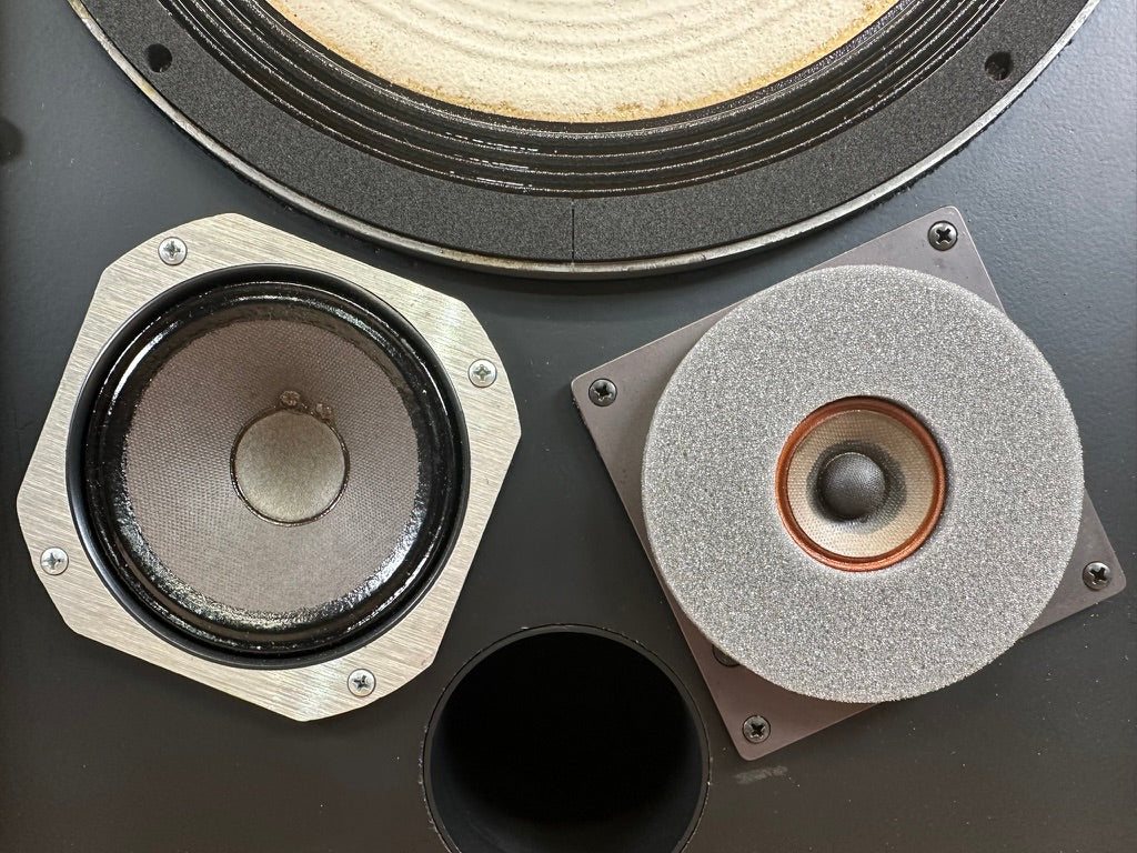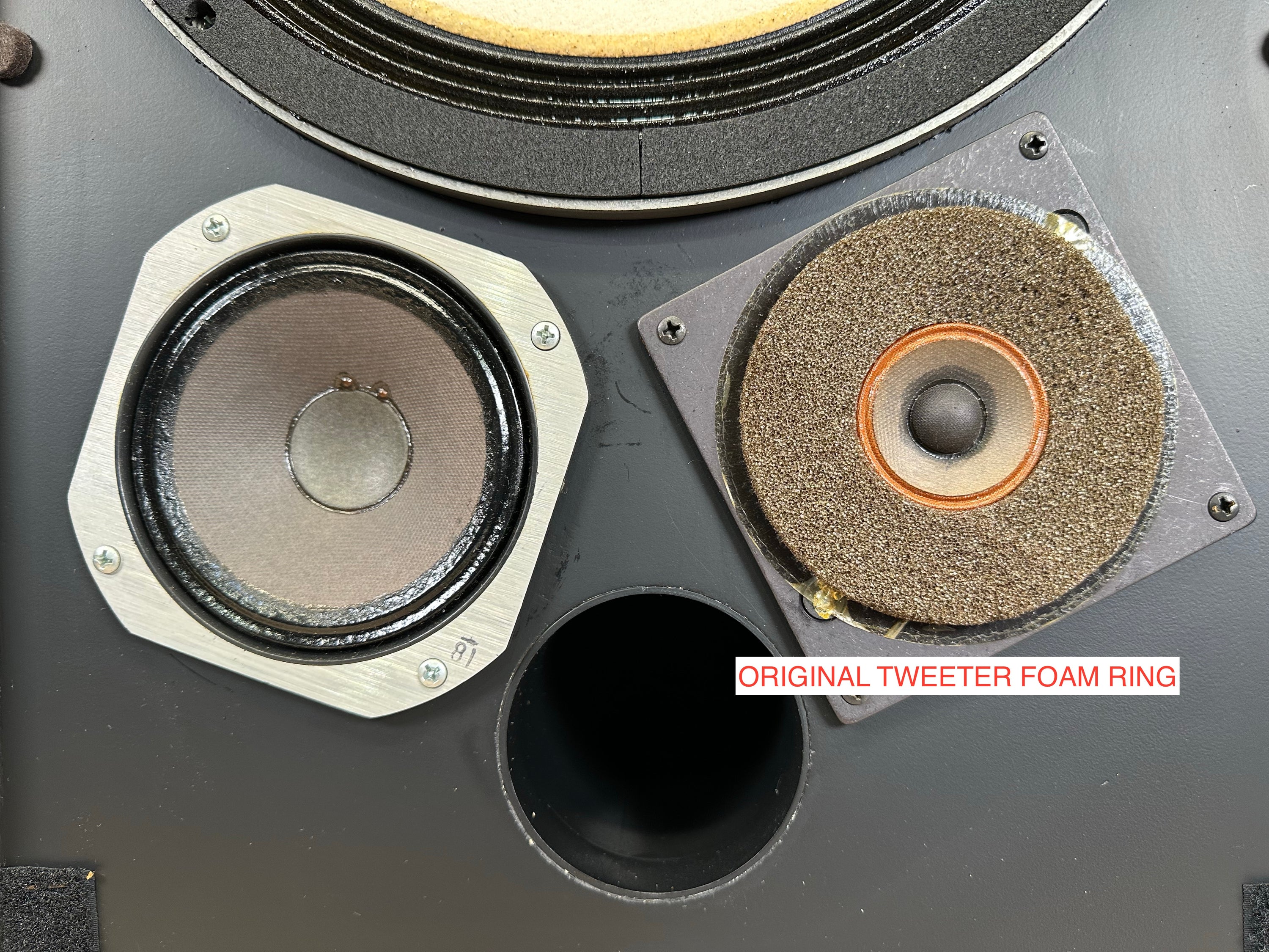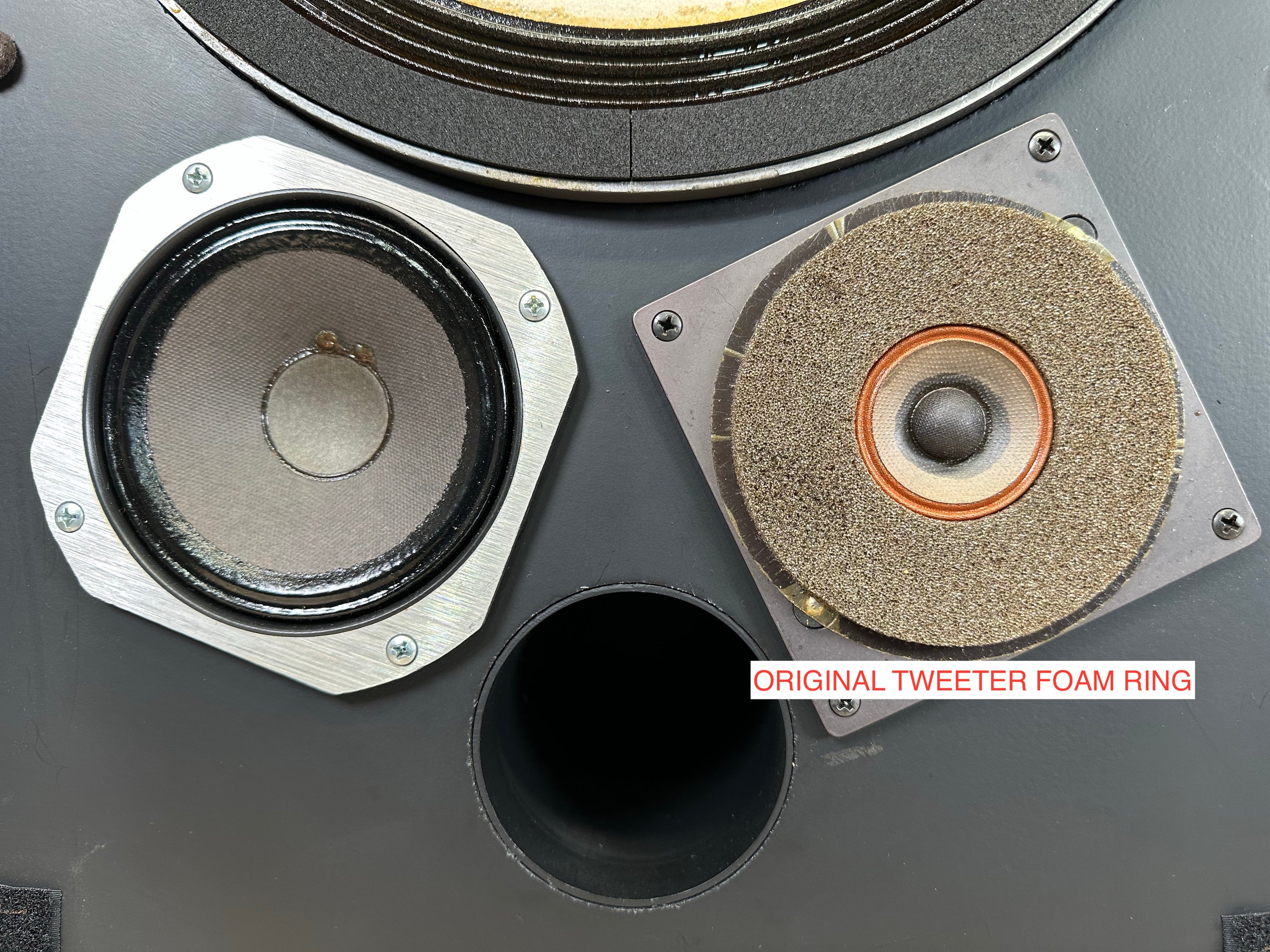 We needed to change out the foam rings around the tweeters. The originals dried out and disintegrated upon touch, which is normal due to their age. We included before and after pictures in the listing of the tweeter surrounds. Also of note, there were small passive filter boxes on the back of the two speakers attached by the original installers. We removed the boxes and filled the two small holes.