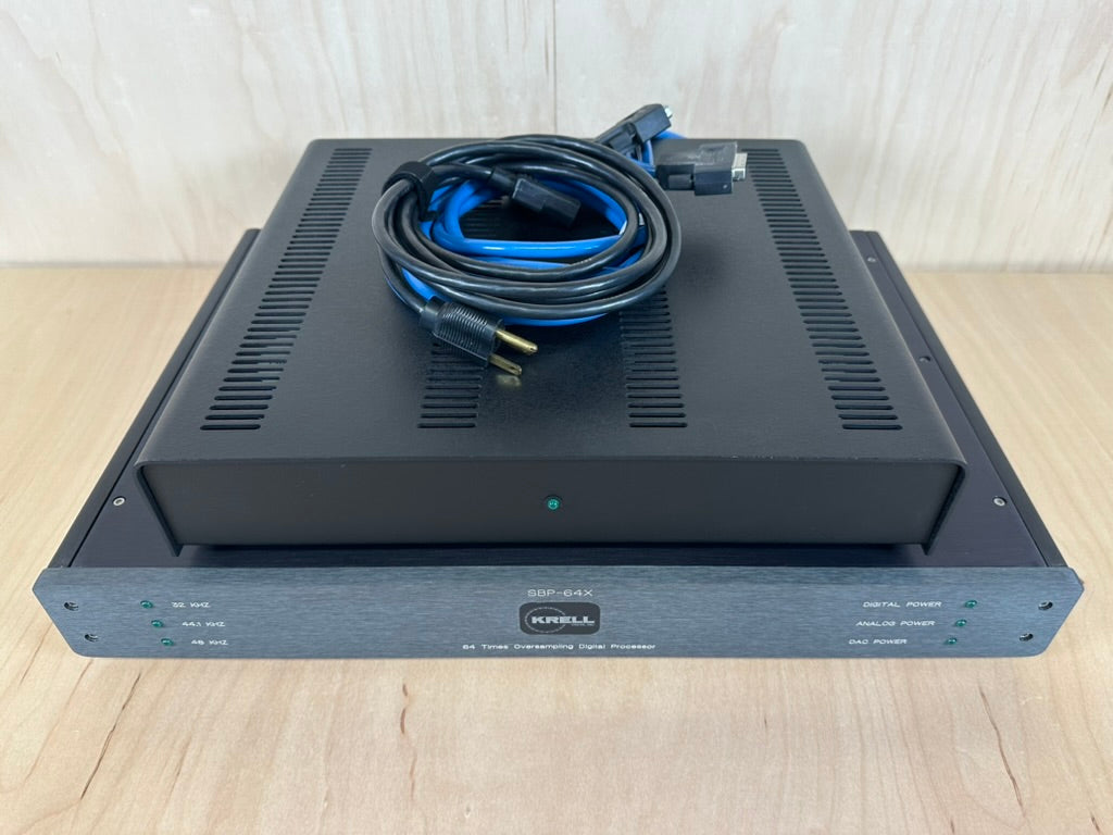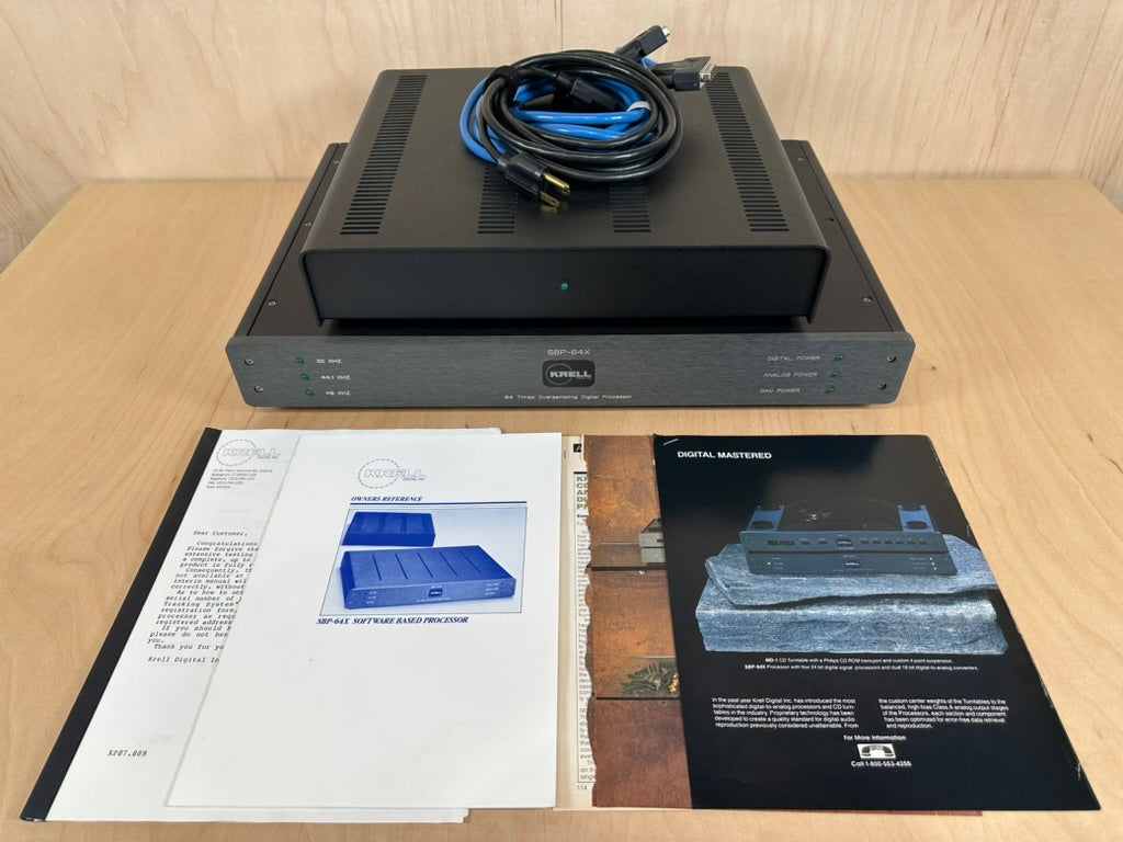 For sale, we have a the classic one owner Krell SBP-64X DAC with its separate power supply.The 64X features custom made KRELL DAC's from scratch, custom circuit, DAC's, oil and Teflon caps, custom power supplies and transformers. The SBP-64X process red book (44.1k) 64 times to smooth out and improve digital playback. The original owner who is a client of ours, was very meticulous, and did a ton of research on all the items that he purchased. Included in the sale is the original owners manual, owners reference booklet, review article, and hype sheet for the unit from Krell. We purchased a complete system from our client, and this along with the other pieces were in constant use since he purchased them new. Never abused, and thoroughly enjoyed, all the gear was well cared for.