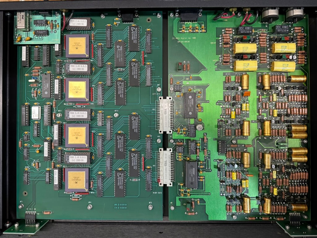 All circuitry following the DACs is discrete, and consists of a current-to-voltage converter, passive filtering and de-emphasis, followed by transformerless balanced output amplifiers, all these circuits working to Krell 'Class-A' principles. The output is DC-coupled, servo- controlled, and has relay protection.