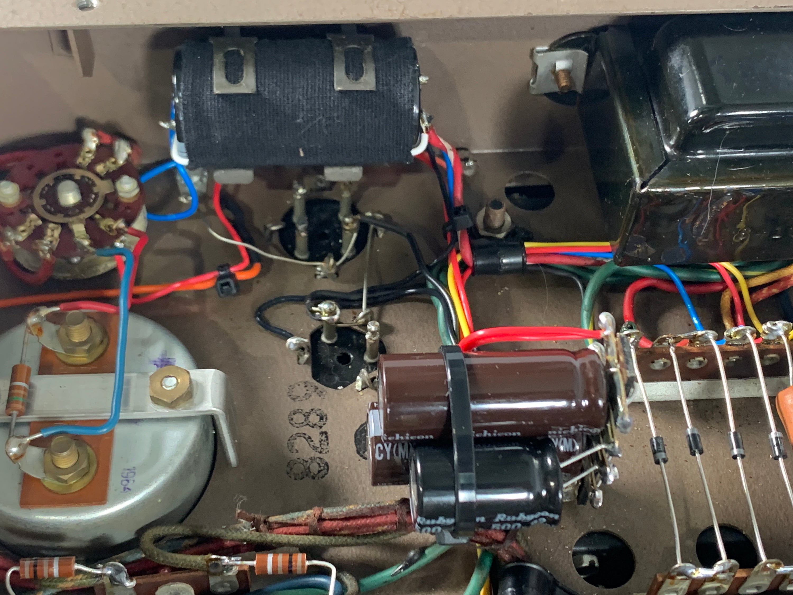 - 6.8 Ohm resistor on one tube socket drifted out of tolerance - replaced with period correct Allen Bradley carbon comp