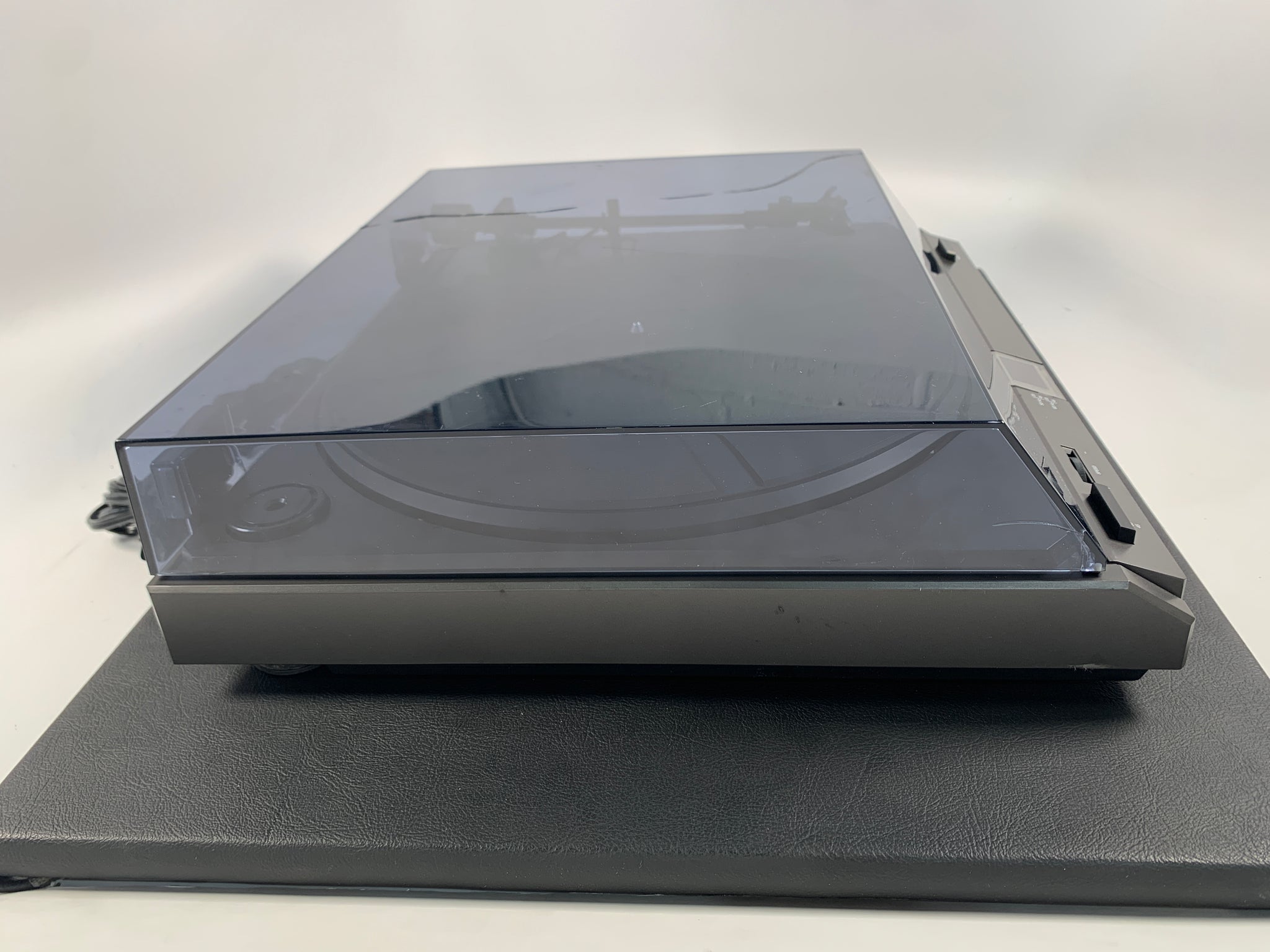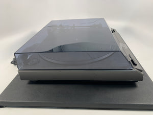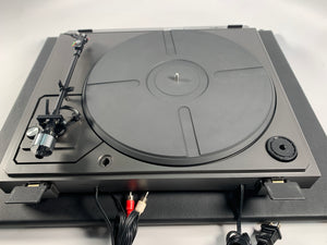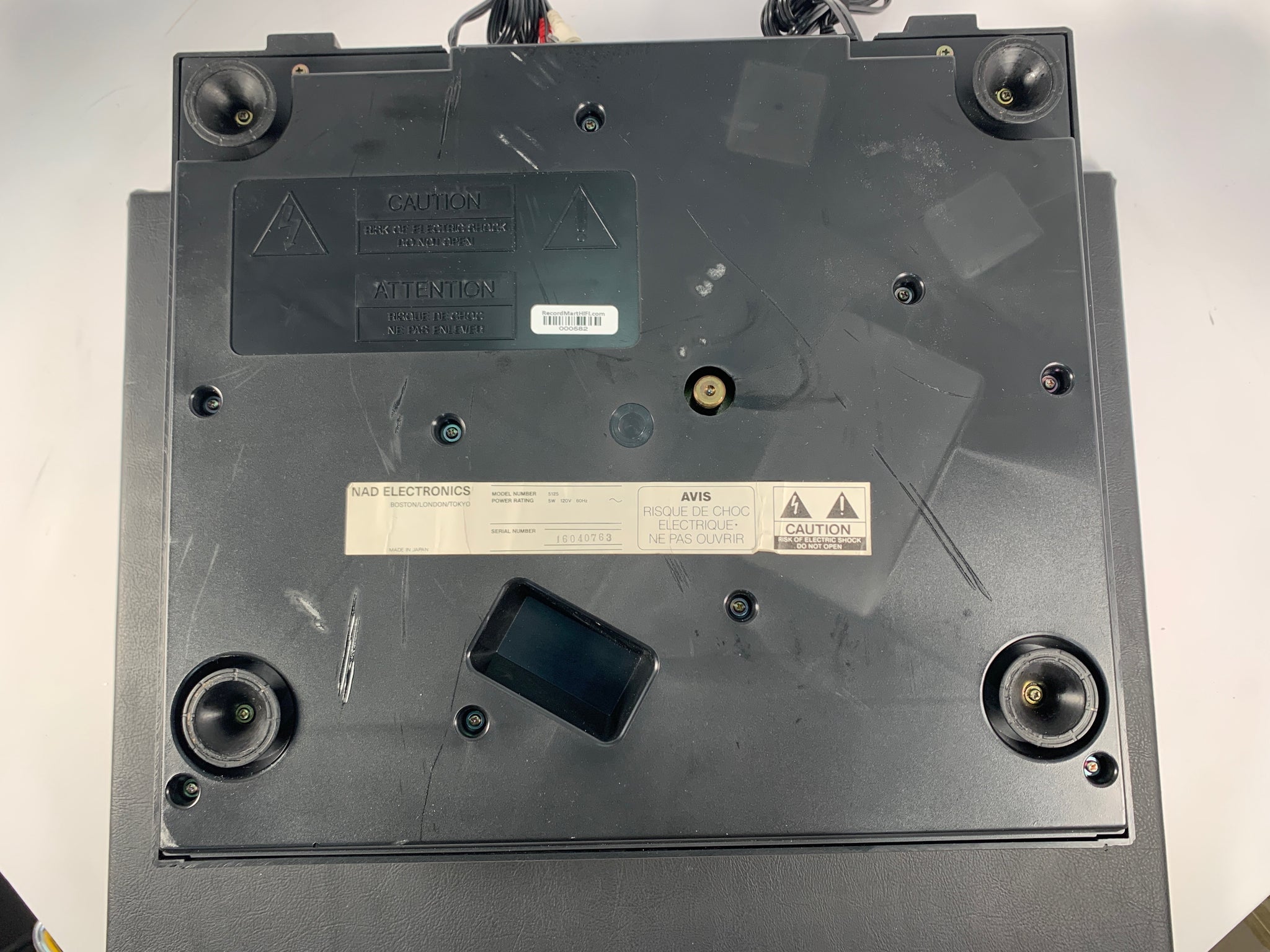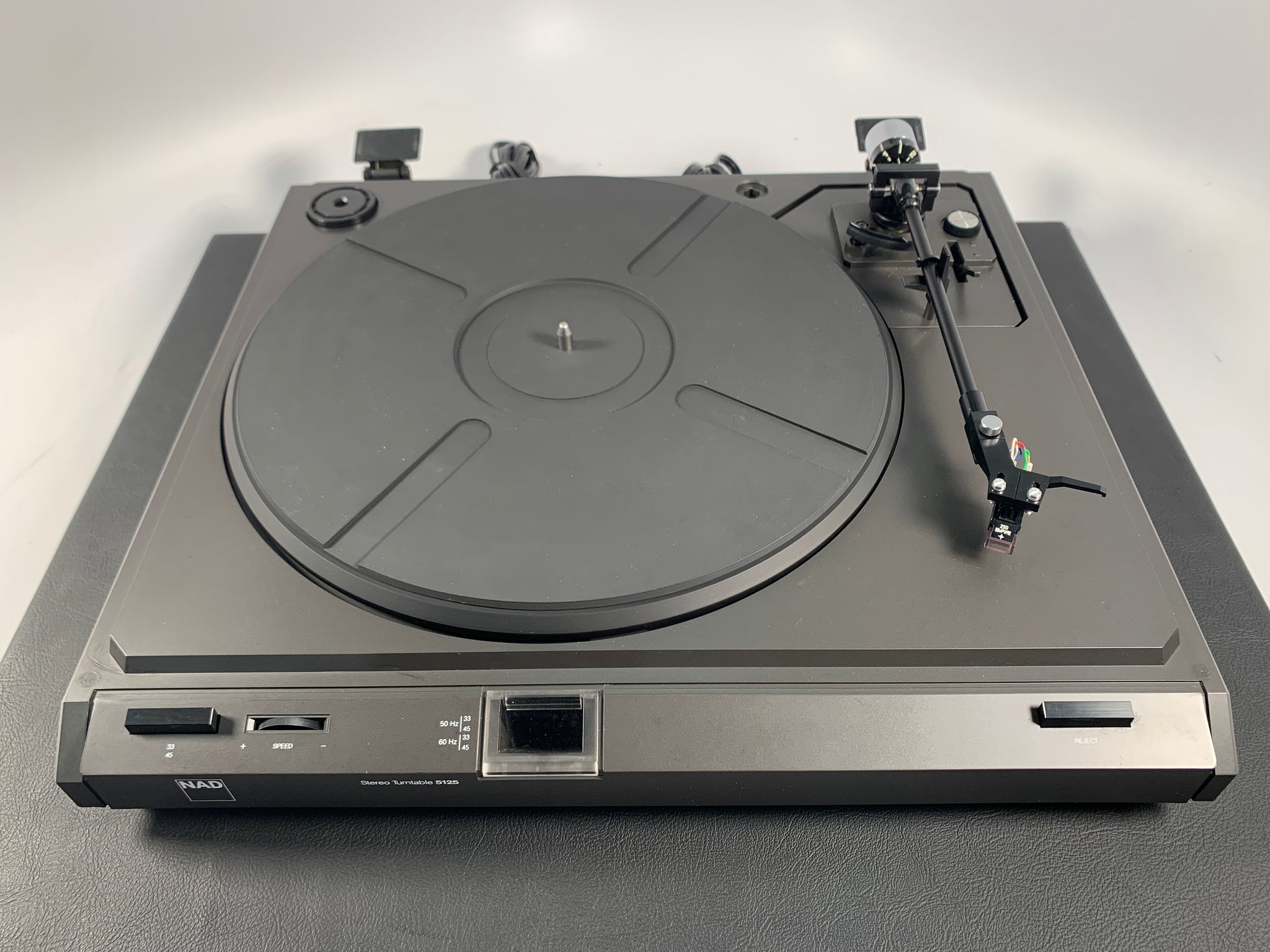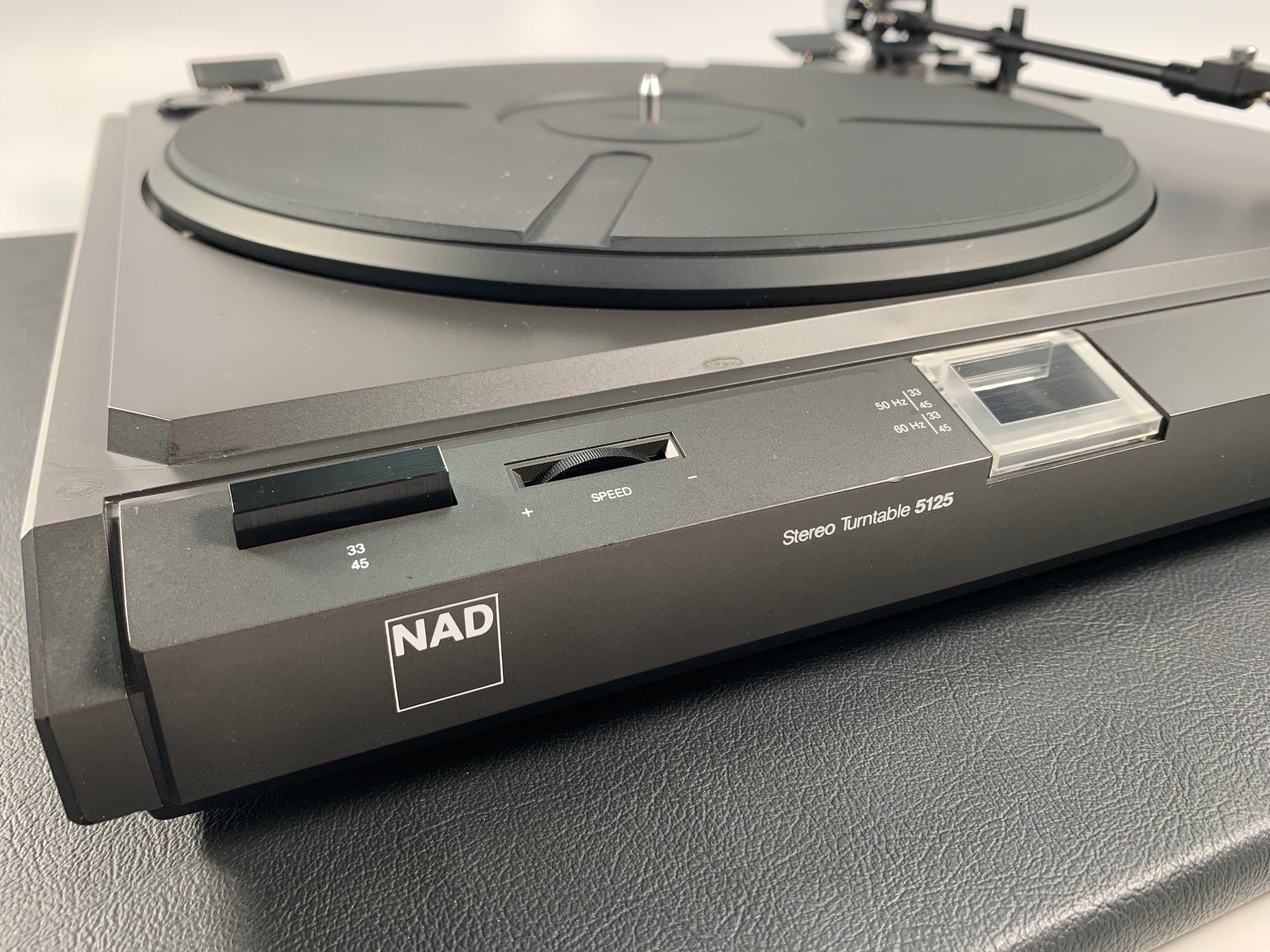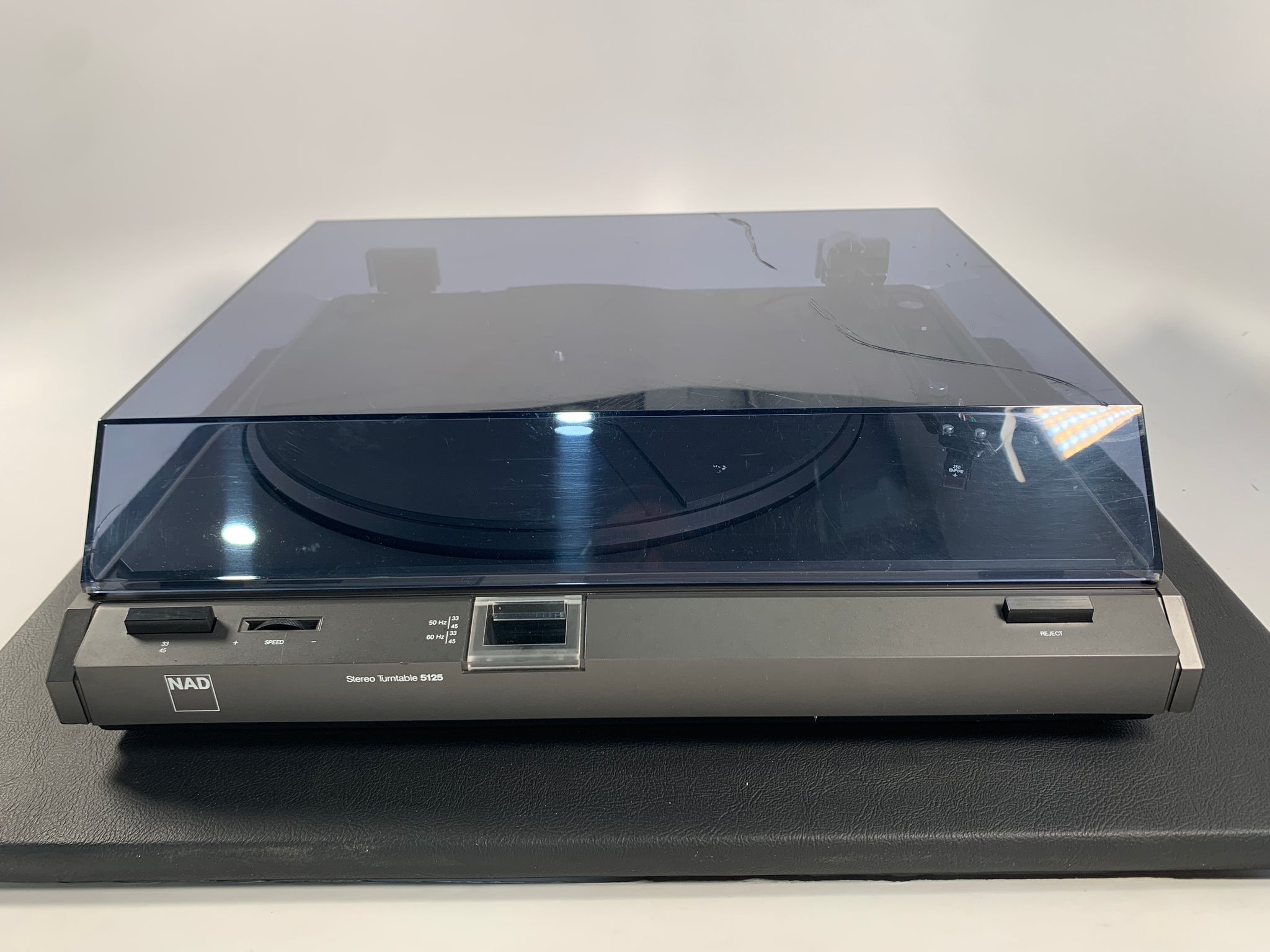 NAD 5125 Stereo Turntable for sale. Cleaned and serviced. New belt installed. Motor bearing lubricated. Empire 250 stylus and cartridge with low hours installed and adjusted. The turntable was fully tested and is in perfect working order. This is a semi-automatic turntable. The arm will return automatically when the record is done. It also has a reject button that will return the arm to home position when pushed. The turntable is in very good condition with only small blemishes. The dust cover has a small 1" crack on front left edge. The top right side of the cover has a long "scar" from front to back. I don't know how it was damaged, but the only way I can describe it is that it looks like a hot wire melted a crevice in the cover. While the cover is not pretty on top, it is fully intact and has protected the turntable itself. The platter, head-shell, counterweight, cover, and hinges will be removed for shipping. The unit comes complete with cartridge and 45 adapter.