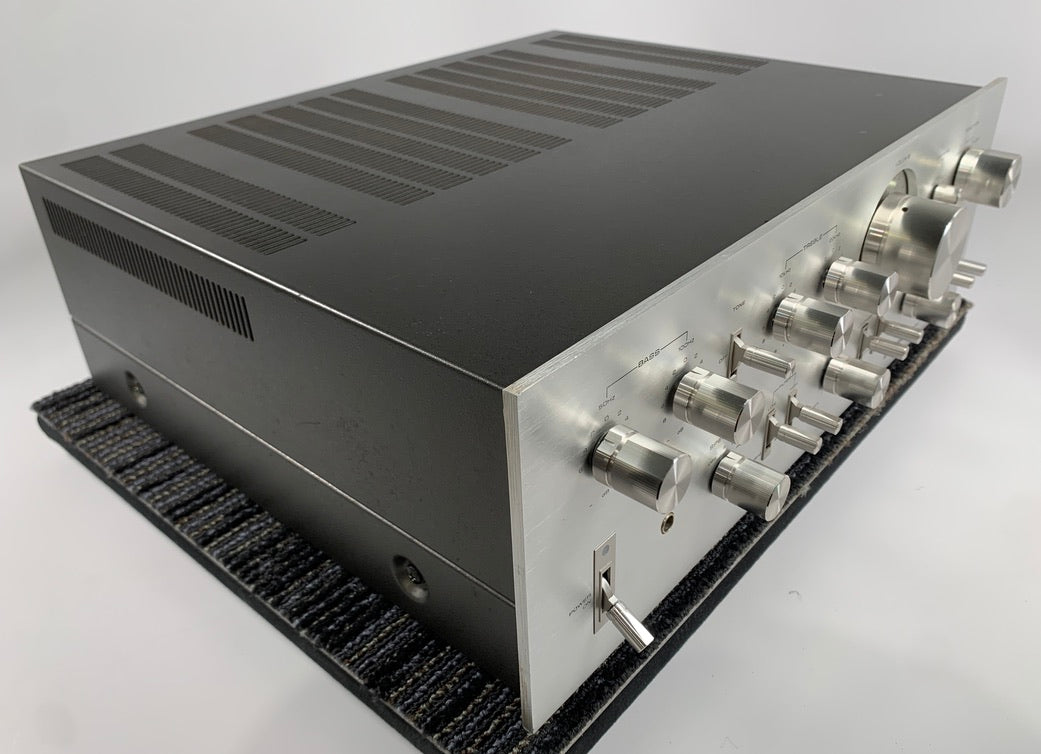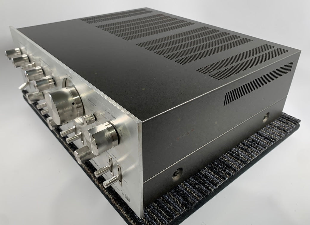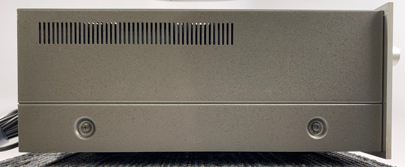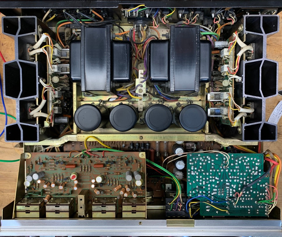 Operationally, the unit is in perfect working order, and it was completely gone through. Before turning the unit on, we inspected inside for signs of wear to components as a result of heat or physical damage. We checked for leaking or bulging capacitors, as well as resistors that might have been running hot and show signs of damage. The unit showed no signs of damage and was very clean on the inside. We then cleaned all pots and switches, and then treated them with Deoxit F5 and D5 respectively. We powered up the unit using a dim bulb and a variac to make sure there were no shorts. We then switched to full street power and let the unit warm up for 20 minutes.  We then checked and adjusted the DC offset, and set the bias according to Pioneer's specifications. We then hooked the unit up to a Sencore PA81 Stereo Stereo Power Amplifier Analyzer acting as a dummy load and Oscilloscope interface. Using an audio generator, we ran a 1k signal through the amps input, slowly increasing the amplitude while monitoring the output on our oscilloscope for signs of noise, clipping, distortion, or improper channel balance. Both channels tested clean on the scope.  The amp is conservatively rated at 80 watts per channel, and   produced a clean signal at 80 watts per channel, and it did not clip until it reached 108 watts per channel.