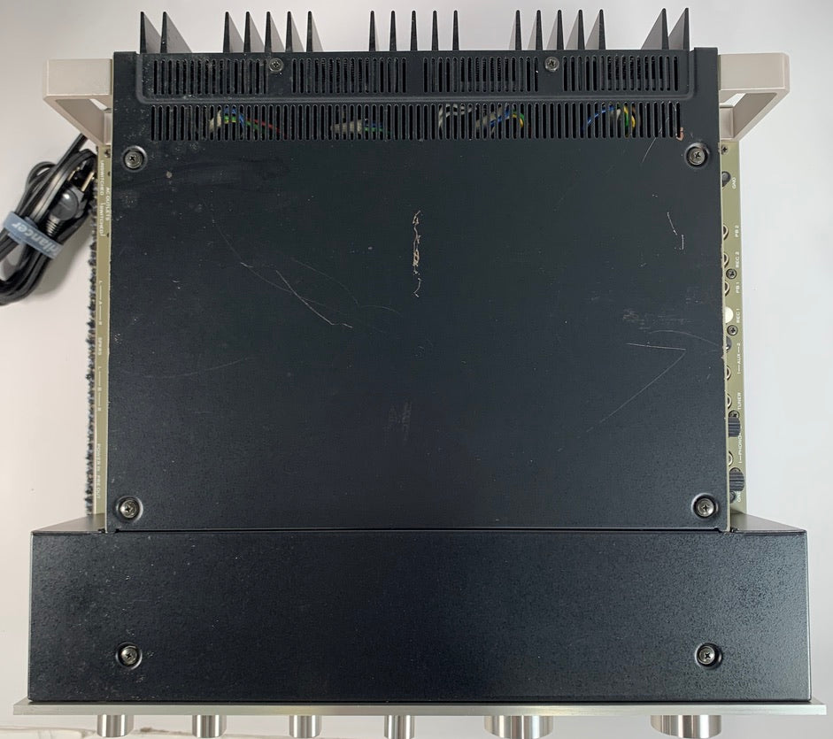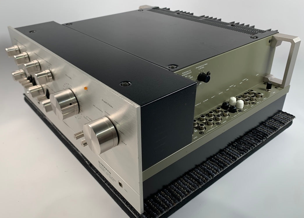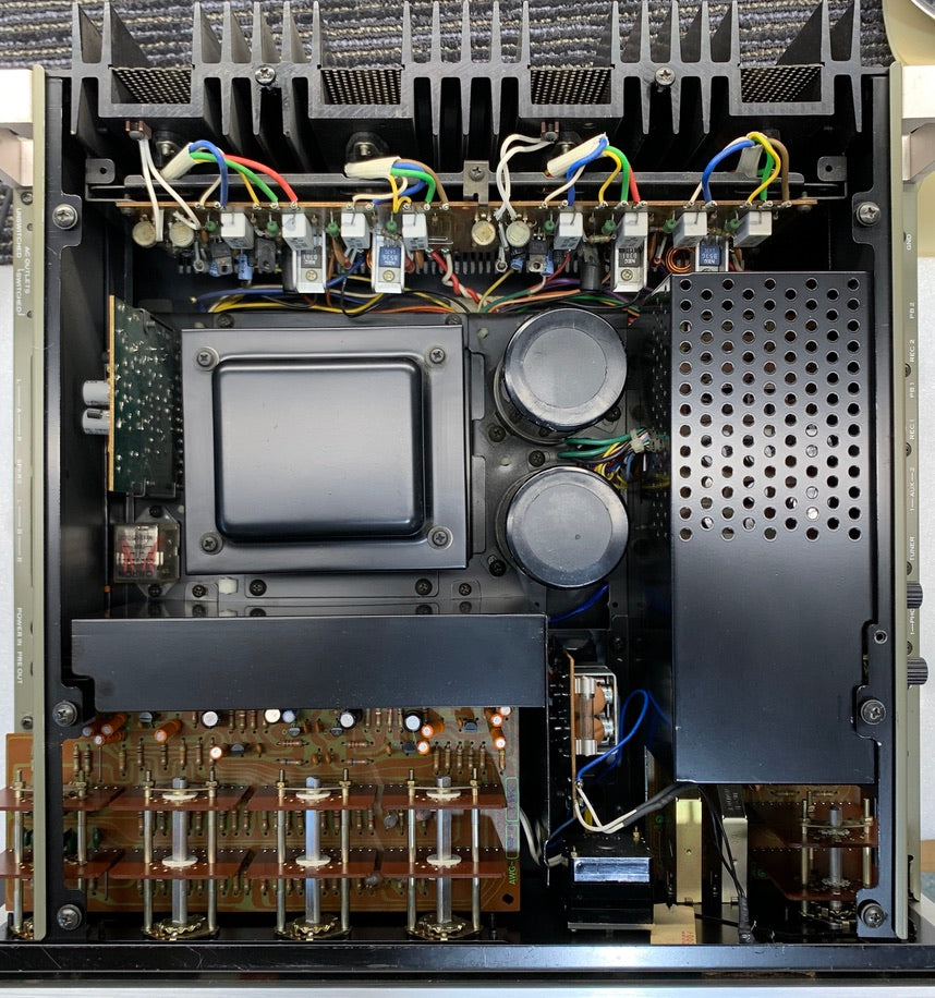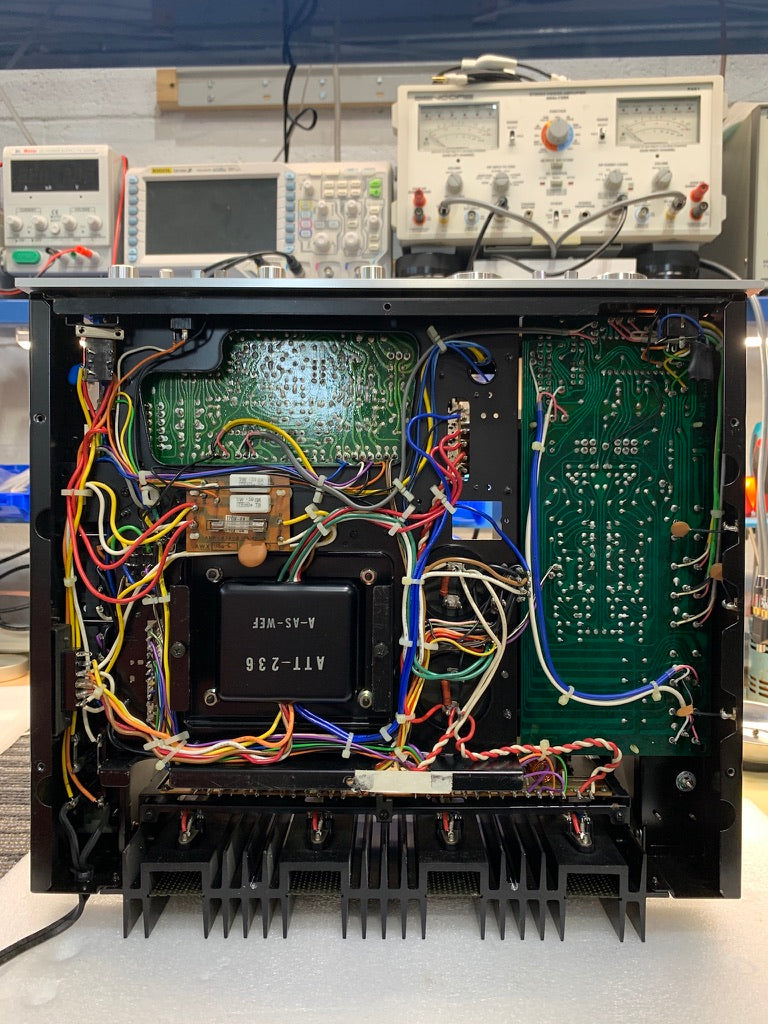 Operationally the unit is in perfect working order. We thoroughly went through the amp on our workbench. We started with a visual inspection looking for any faulty components. The unit checked out with no signs of any bulging capacitors or damaged components. All pots and switches were then cleaned out and then treated with Deoxit F5 and D5 respectively. We then then ran the amp and it sounded very good, with all pots and switches making no noise or scratching when operated. Next up, we adjusted the Audio section to factory specifications following Pioneer's procedure in the service manual. After the adjustments, we ran the amp in our house system for the day playing numerous lp's on both phono sections, and we tested all the inputs. This amp is known to develop a turnoff pop with age, which this one developed. We addressed the issue in the protection circuit board by replacing the necessary transistor, cap and resistors. There is no turnoff pop when shutting down this unit.