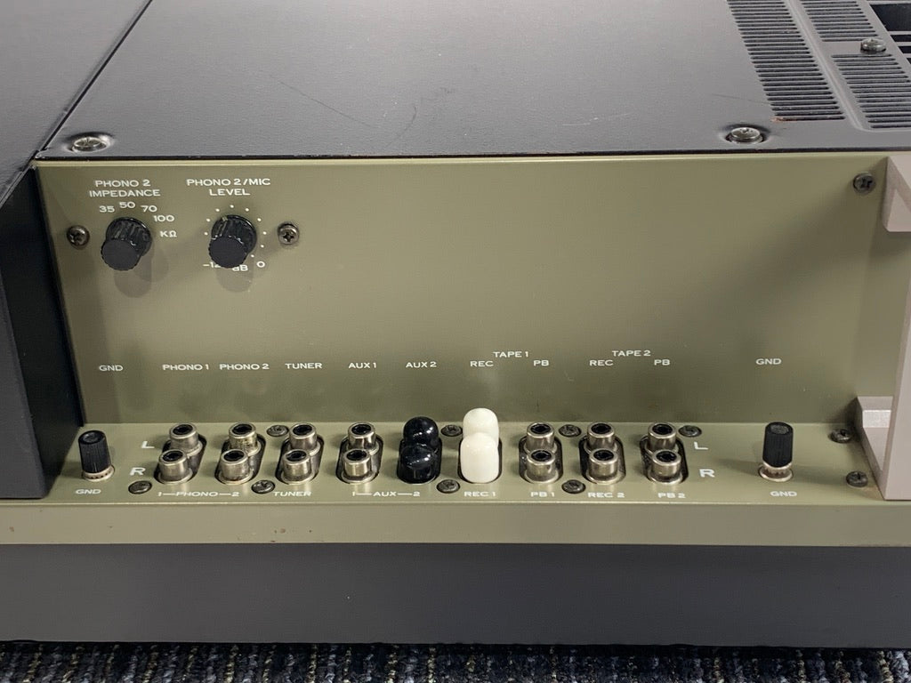 Truly a wonderful sounding integrated amp, with two nice phono sections. The Phono 2 input has a pot to adjust the impedance and another to vary the output level. There are 2 tape inputs, Tuner, 2 Aux, and a Mic input as well. Built like a tank, these units are just nice to look at, listen to, and just fun to play around with. The chunky volume, and source knobs, the toggle switches, we just can't get enough of them. This unit is from the golden age of Japanese receivers and amps. The next owner will be proud to have it in their system.