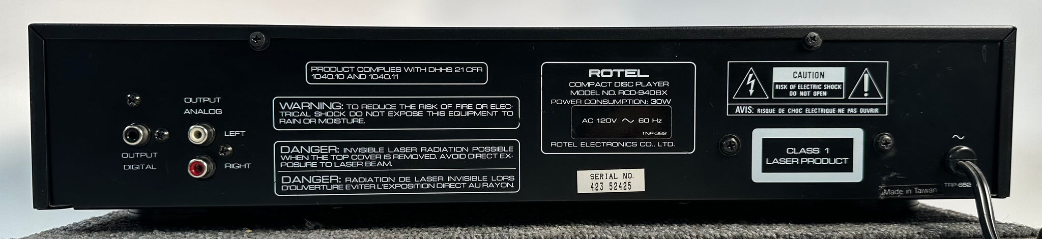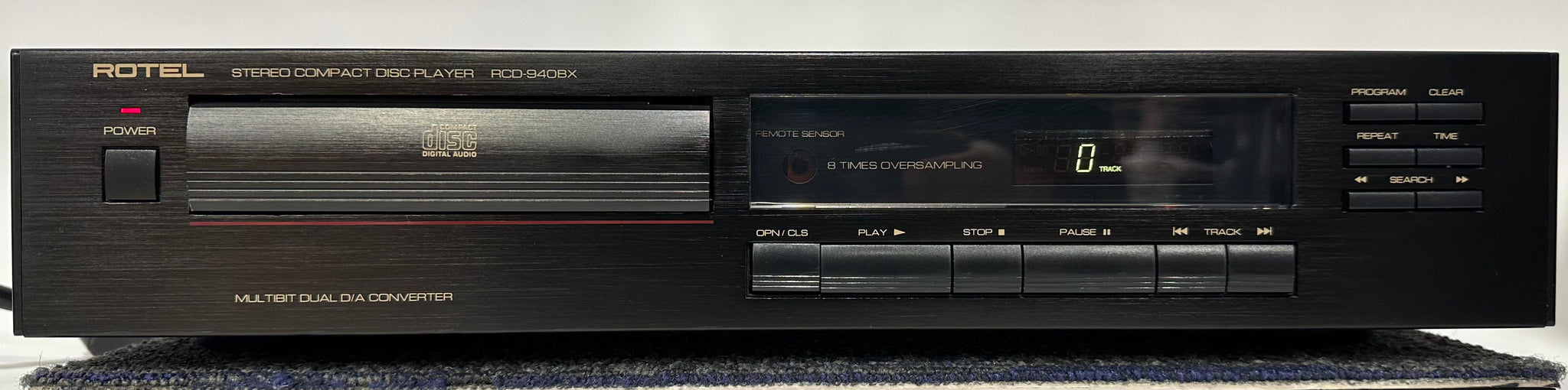 For your consideration, we have a great example of a Rotel RCD-940BX CD Player. The unit is in perfect working order, the display is bright, and the unit sounds excellent. Physically the unit is in good condition. There are several blemishes, and scratches on the top panel, however the faceplate shows little wear. Overall the unit presents itself very well.