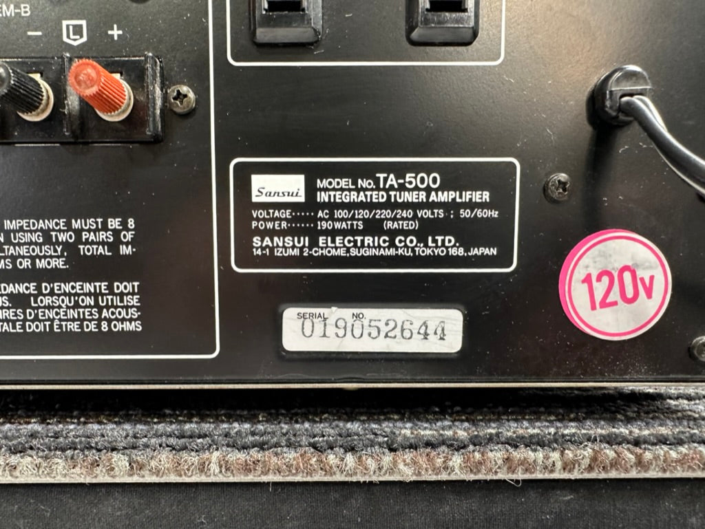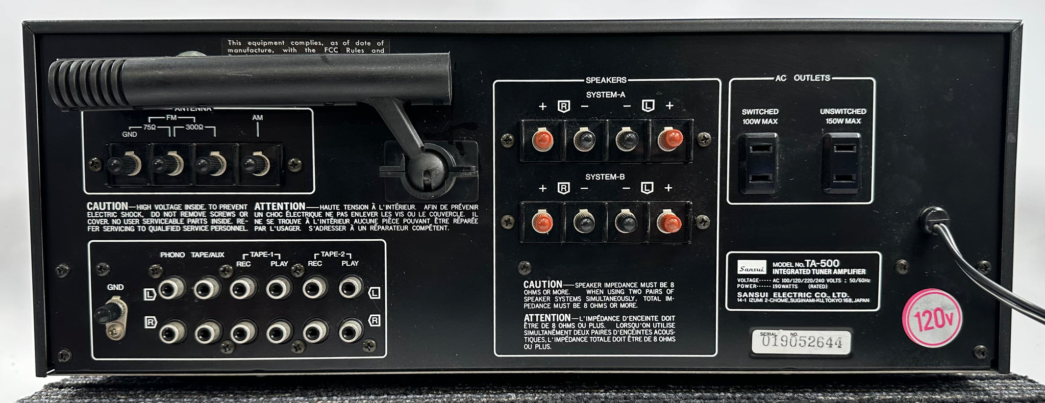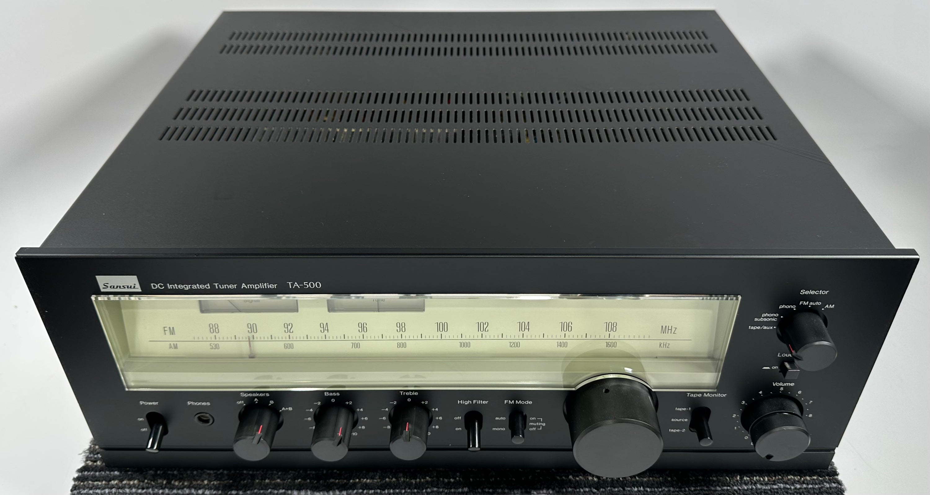 For sale we have a rare, well preserved Sansui TA-500 Tuner Amplifier, with a very nice phono stage. The unit was obtained from a collector and is in good working order. With 45 watts per channel, the unit has ample power and a warm sound. We cleaned all pots and switches and then treated them with Deoxit F5 and D5 respectively. All inputs including the phono stage were checked and performed well. The Tuner, like other Sansui models from this era, sounds very nice. Aside from some light scuffs and blemishes on the unit, it is in very good to excellent physical condition. While we don't have the original box, the TA-500 will be wrapped, and then surrounded on all sides with several inches of polyethylene foam, within a heavy duty box. Water activated, Fiber reinforced tape will be used on all seams.
