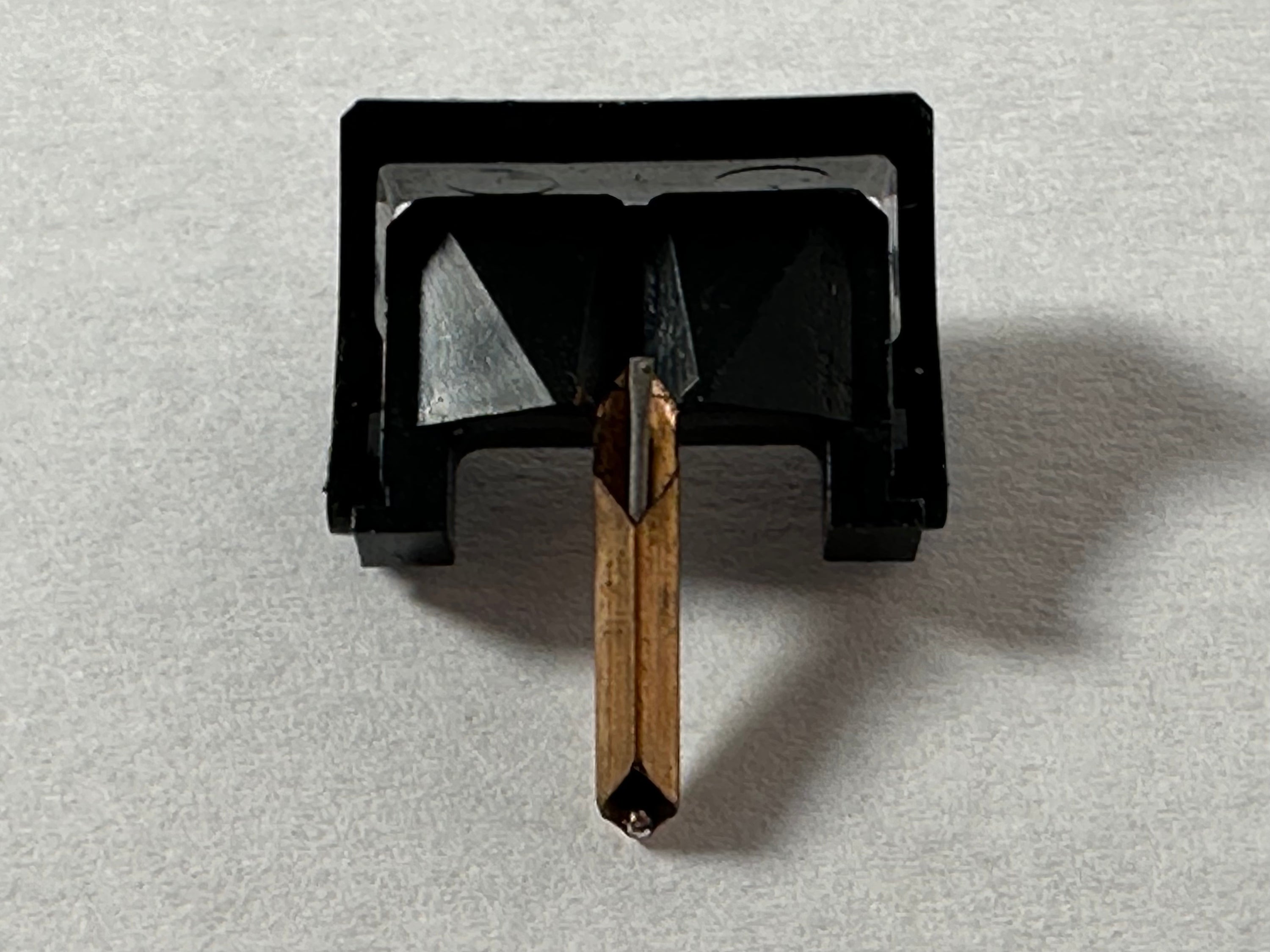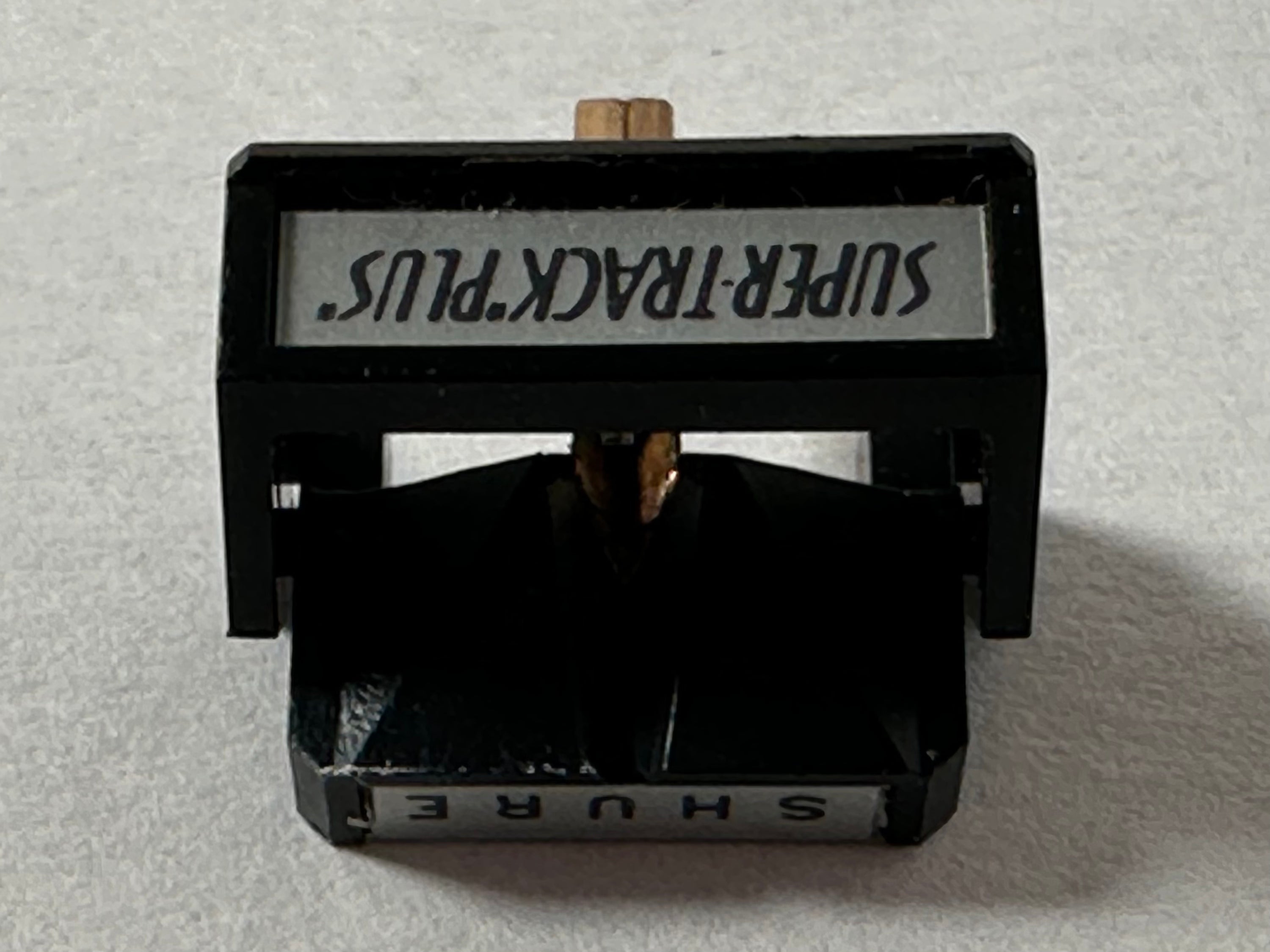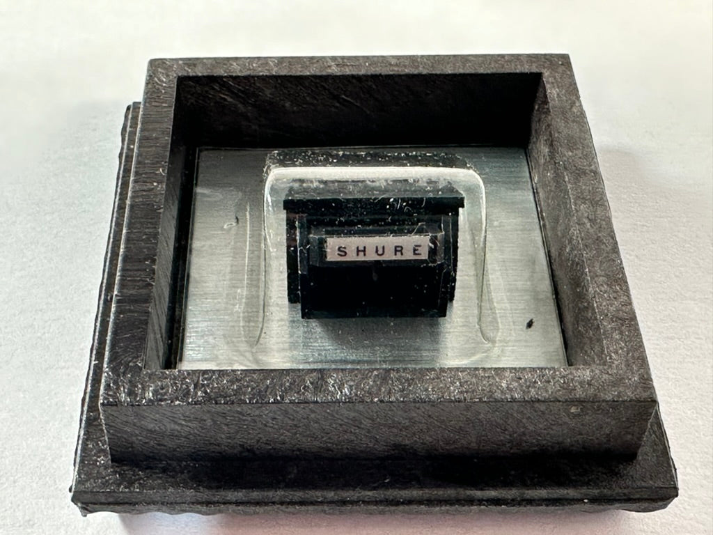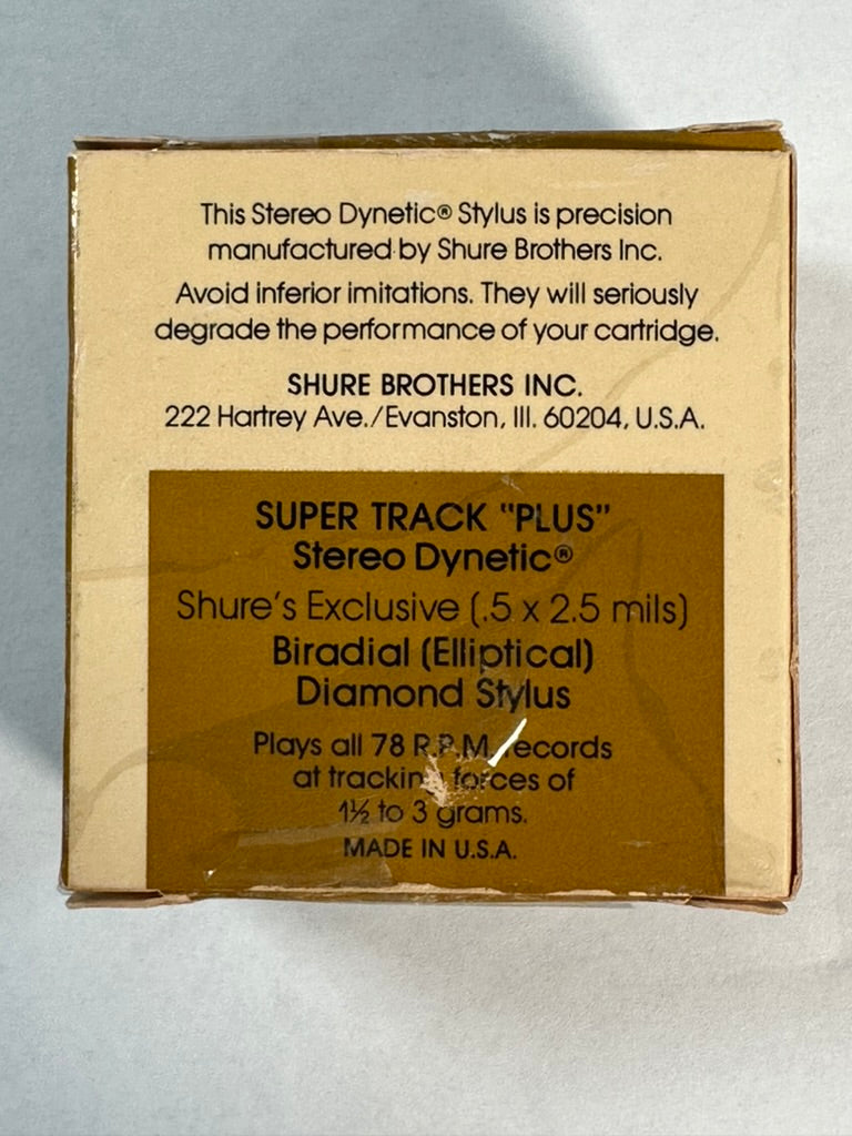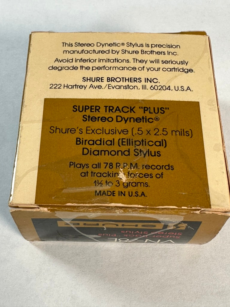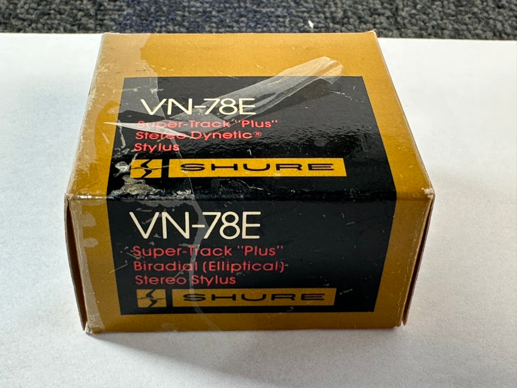 For sale we have a Shure VN-78E Super-Track "Plus" Stereo Dynetic Biradial Elliptical stylus for 78rpm records. The tip is .5 by 2.5 mils and has a recommended tracking force of 1.5 to 3 grams. We acquired this in a collection we purchased, and it appears to be new old stock. The cantilever is straight, and looks unused. The box is old and has some wear, but it is intact. Please see the pictures for further details.