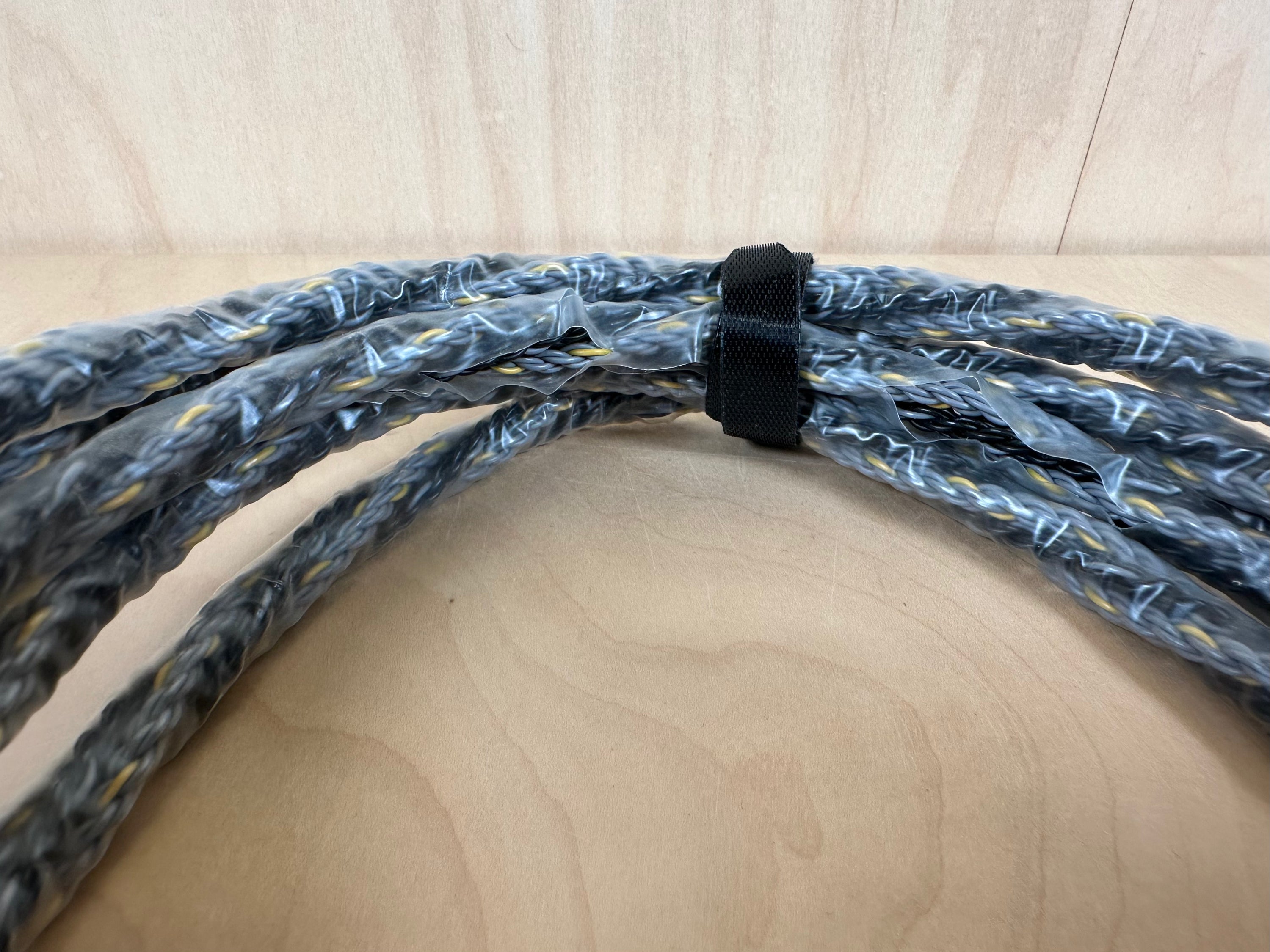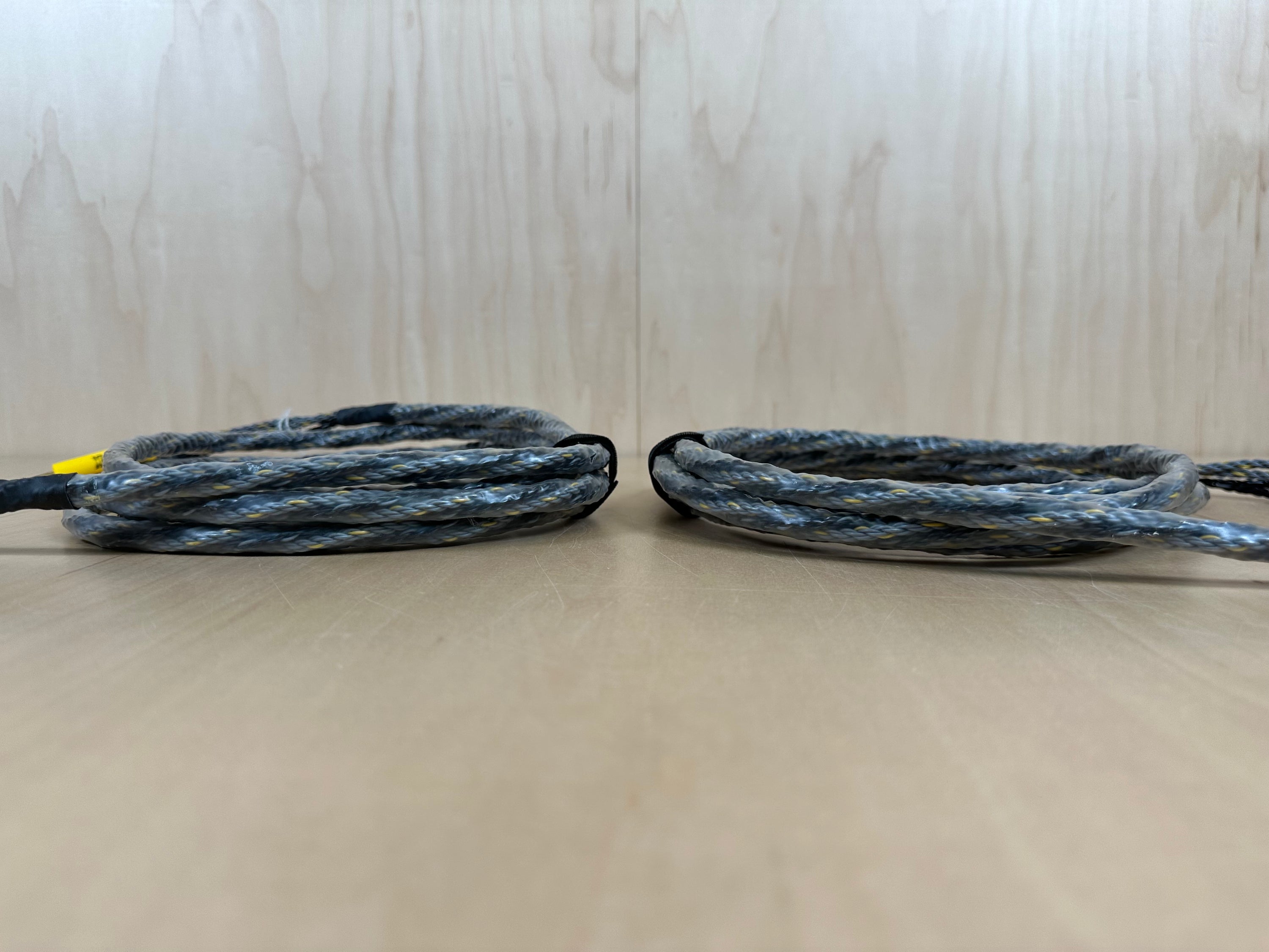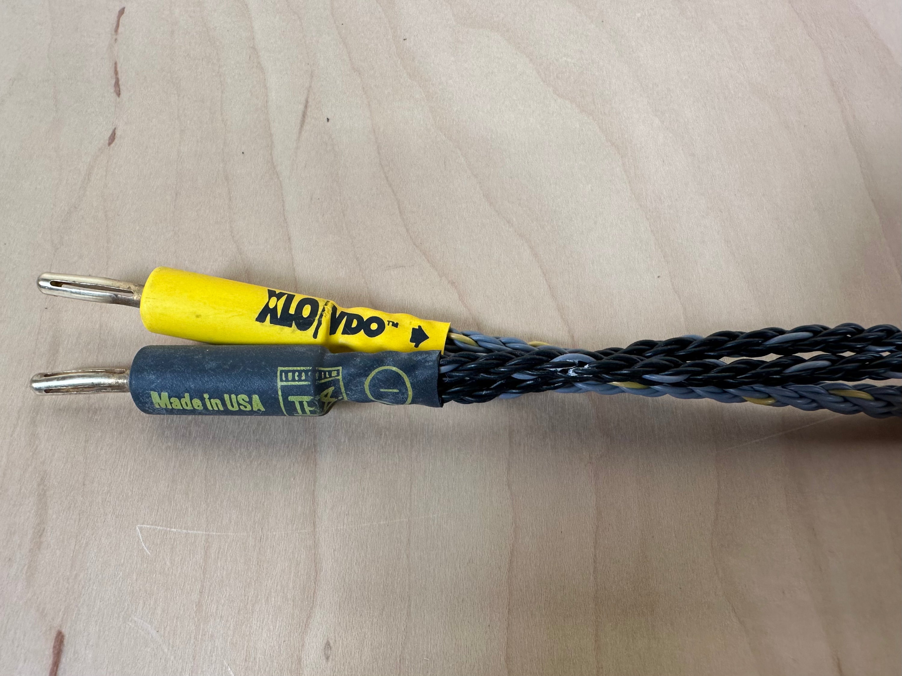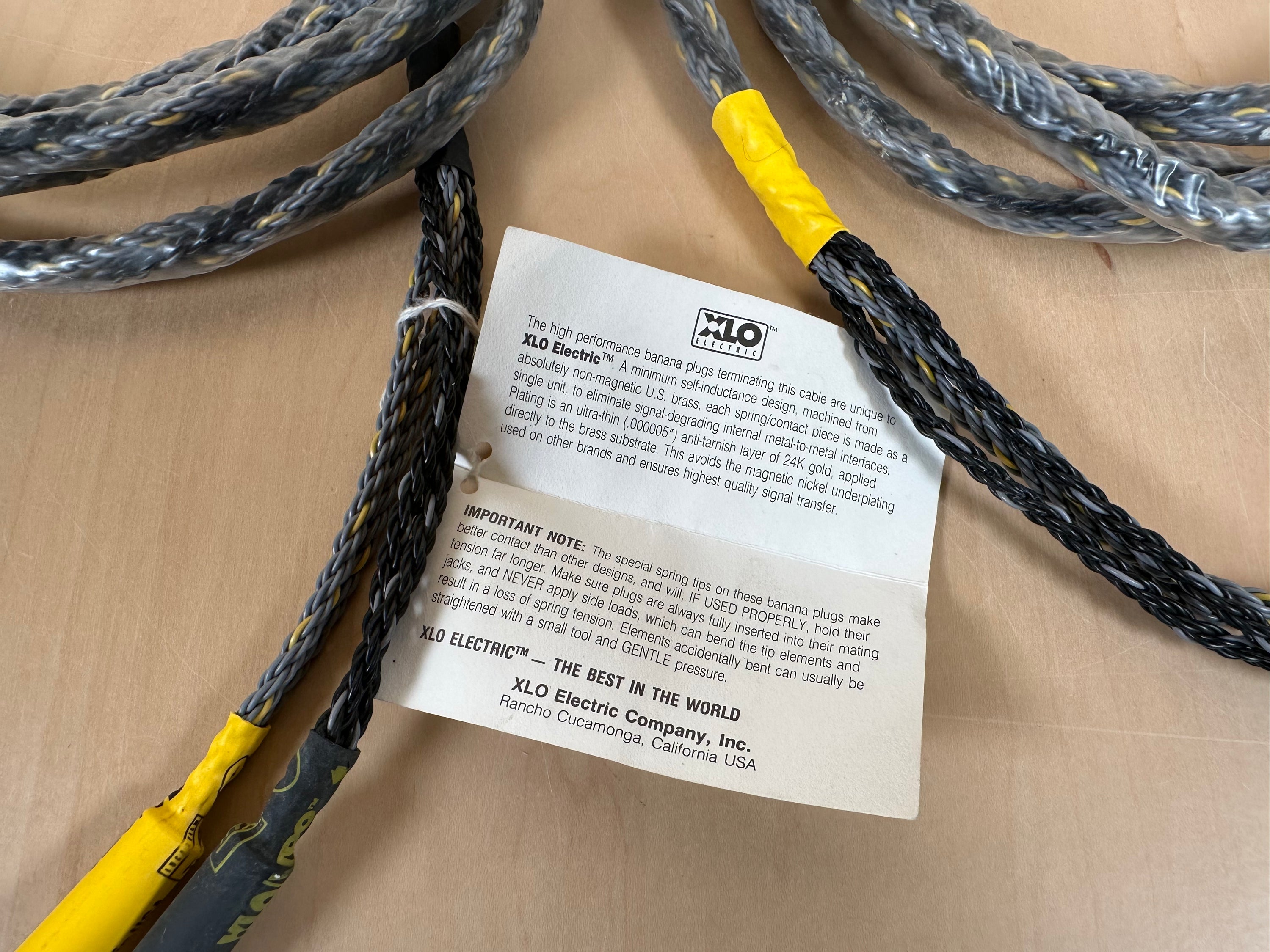 For sale, we have a 10 foot pair of XLO/VDO ER-11 Speaker cables with Banana jack terminations on both ends. The positive side of the cables are Gray, and Yellow, and the negative side is Black and Gray. The cables have the original factory XLO Banana terminals on both sides, with the original heat shrink. There is some wear on the terminals and the heat shrink, but nothing that would affect their function. The only other blemish is on the cable with the tag on it, where there are some splits on the opaque outer jacket, but not in the speaker wires. There are some closeup pictures showing the splits. Overall, the cables present themselves very well. See the pictures in the listing for further details.